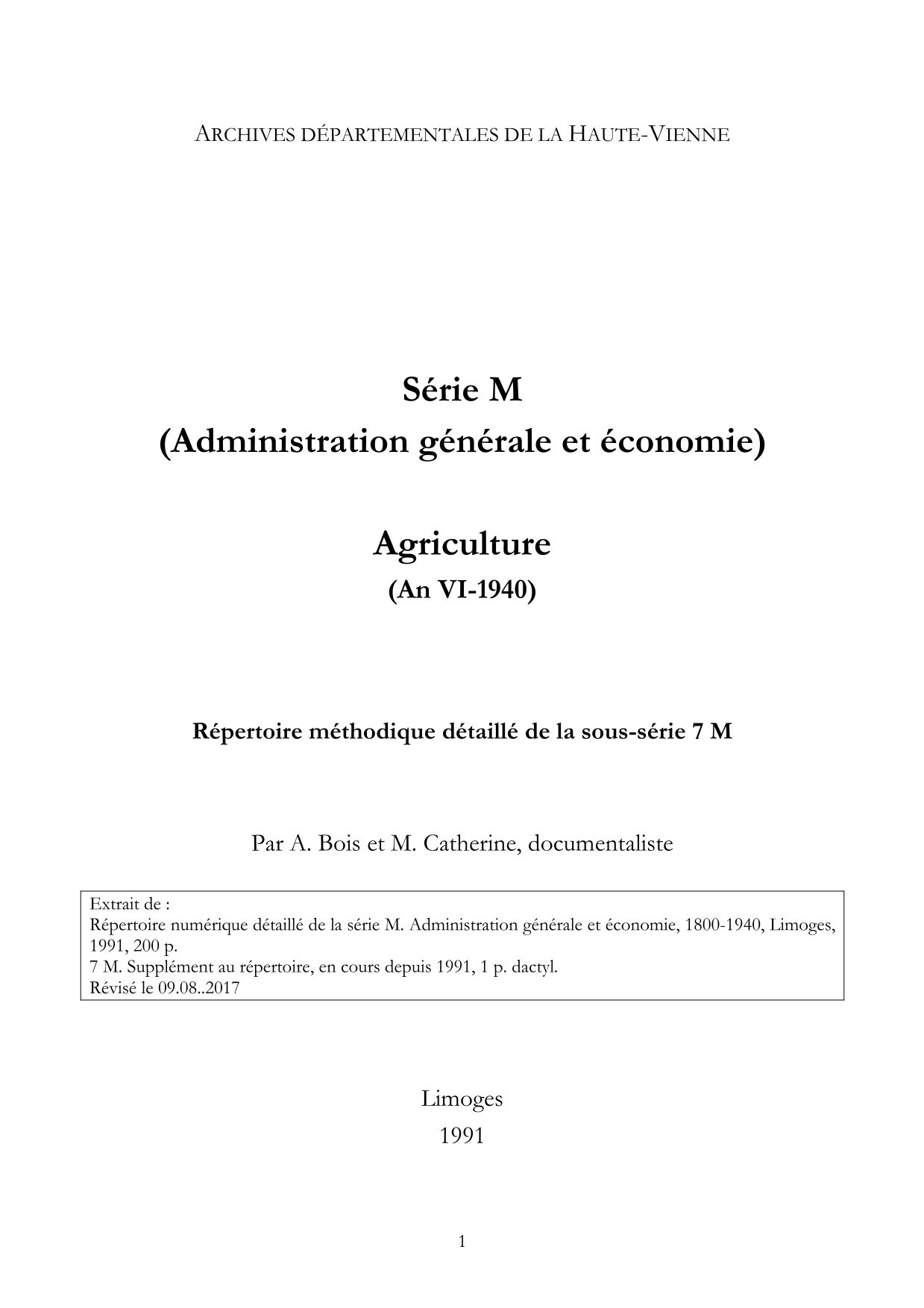 7 M. Répertoire numérique détaillé, par A. Bois et M. Catherine (extrait du répertoire imprimé en 1991, p. 105-117). 7 M. Supplément au répertoire, en cours depuis 1991, 1 p. dactyl. On y trouve les documents versés aux archives depuis 1991 mais antérieurs à 1940 et ayant donc organiquement leur place en série M (7 M 242-245).