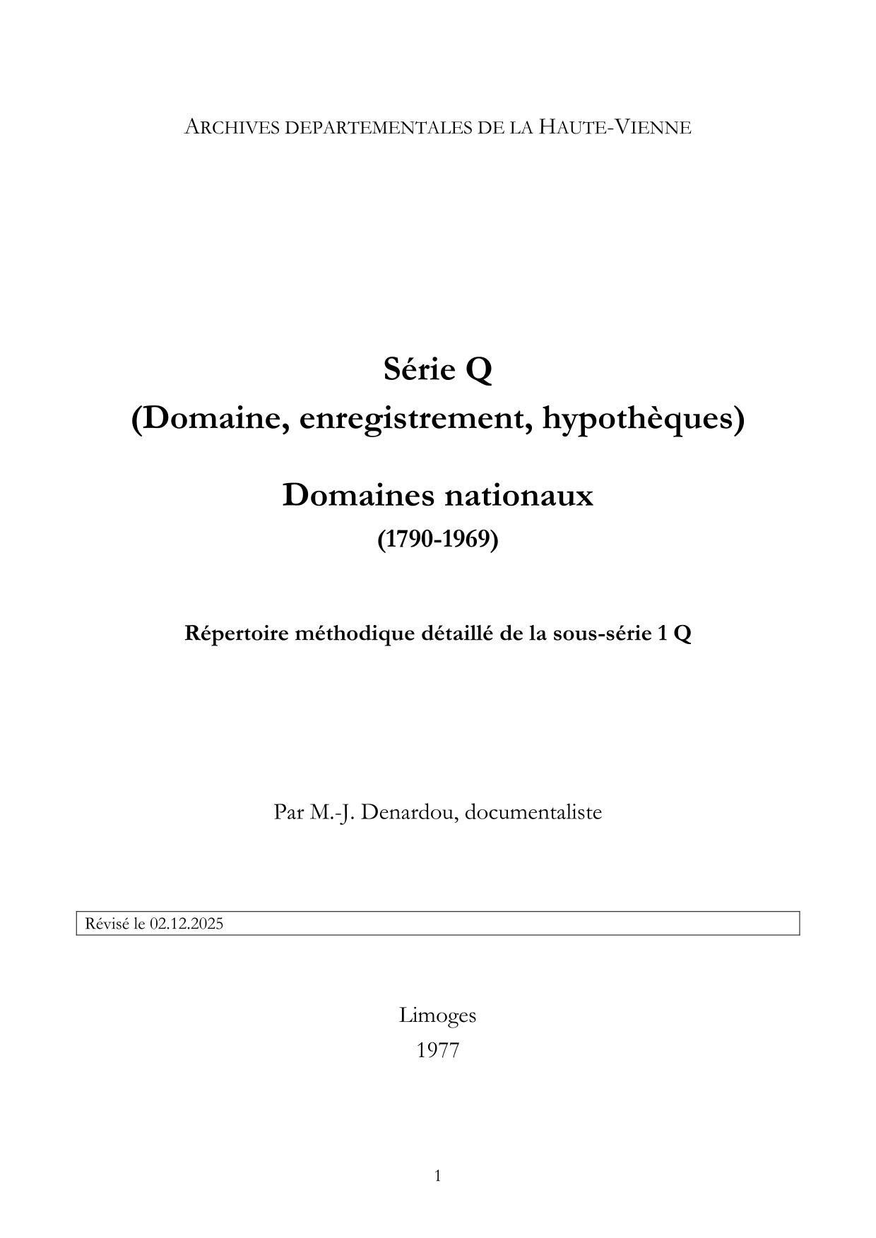 1 Q. Répertoire numérique, [par M.-J. Denardou], 1977, révisé par Louis Borel de Bretizel le 2 mai 2025, 121 p. dactyl.