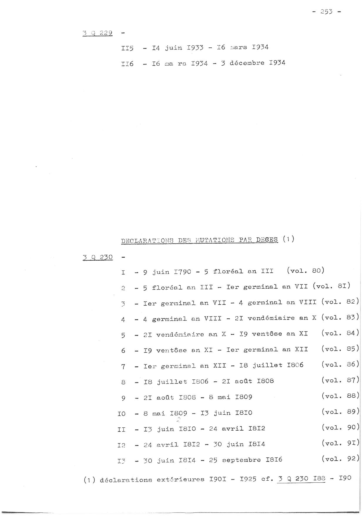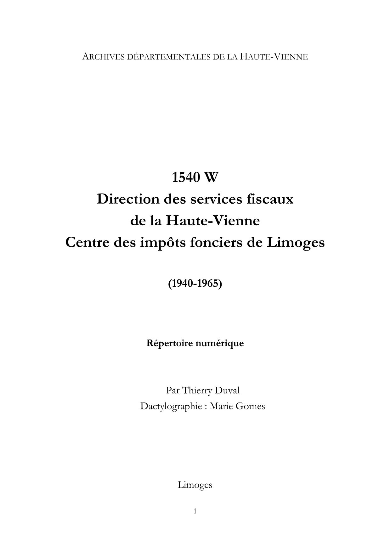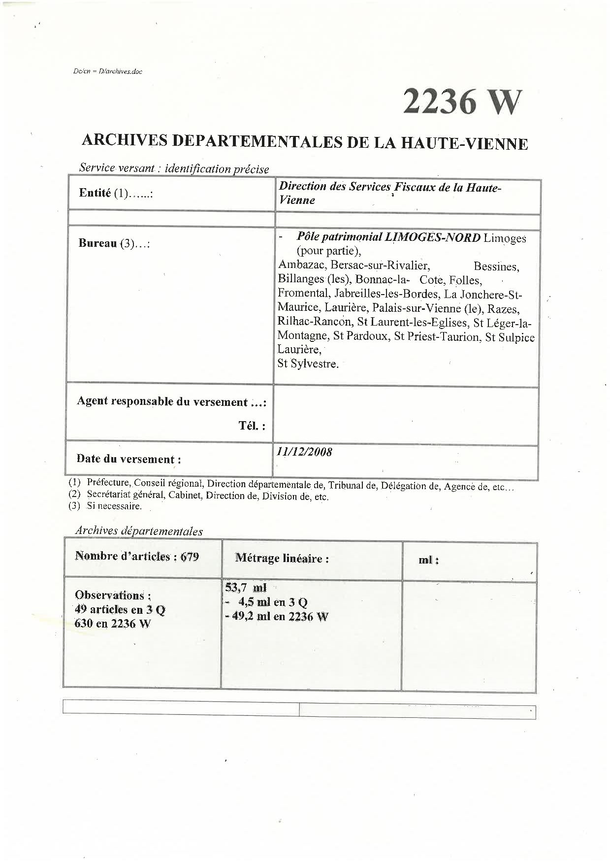 Bureau de Limoges Après 1940, cf. versement 1540 W, versement 1777 W et versement 2036 W pour les déclarations de successions. Consulter l'instrument de recherche (3 Q 230 - déclarations de successions - 1790-1940) (5.6 Mo) Versement 1540 W (107.2 Ko) Versement 1777 W (33.3 Ko) Versement 2236 W (242.8 Ko)