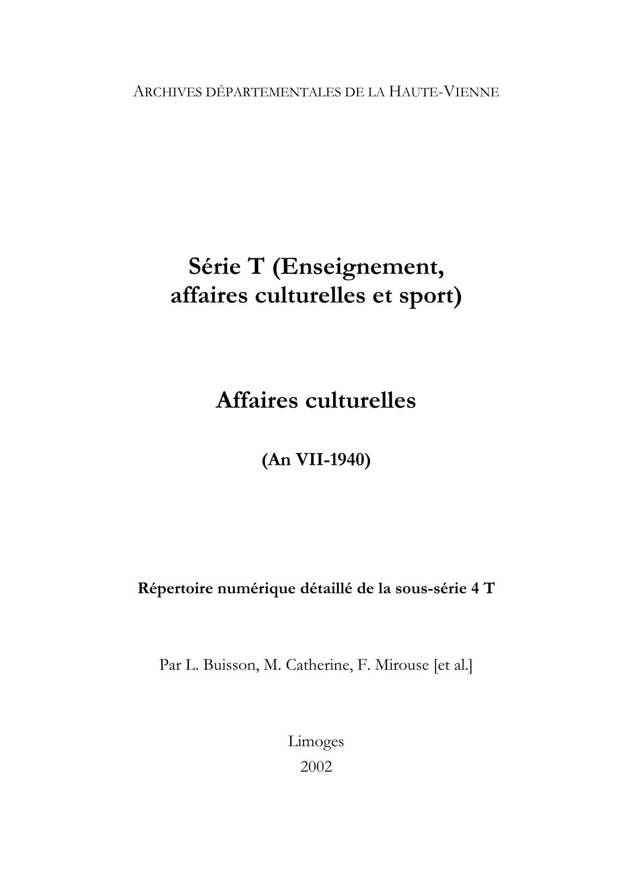 4 T. Répertoire numérique imprimé, par L. Buisson, M. Catherine, F. Mirouse, [et. Al.], Limoges, 2002, 200 p.
