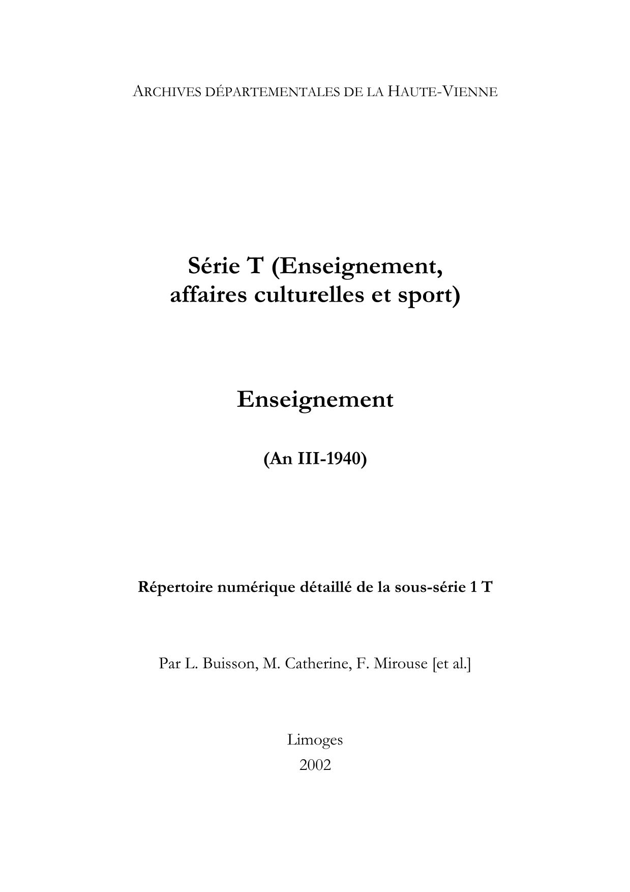 1 T. Répertoire numérique imprimé, par L. Buisson, M. Catherine, F. Mirouse, [et. Al.], Limoges, 2002, 200 p.