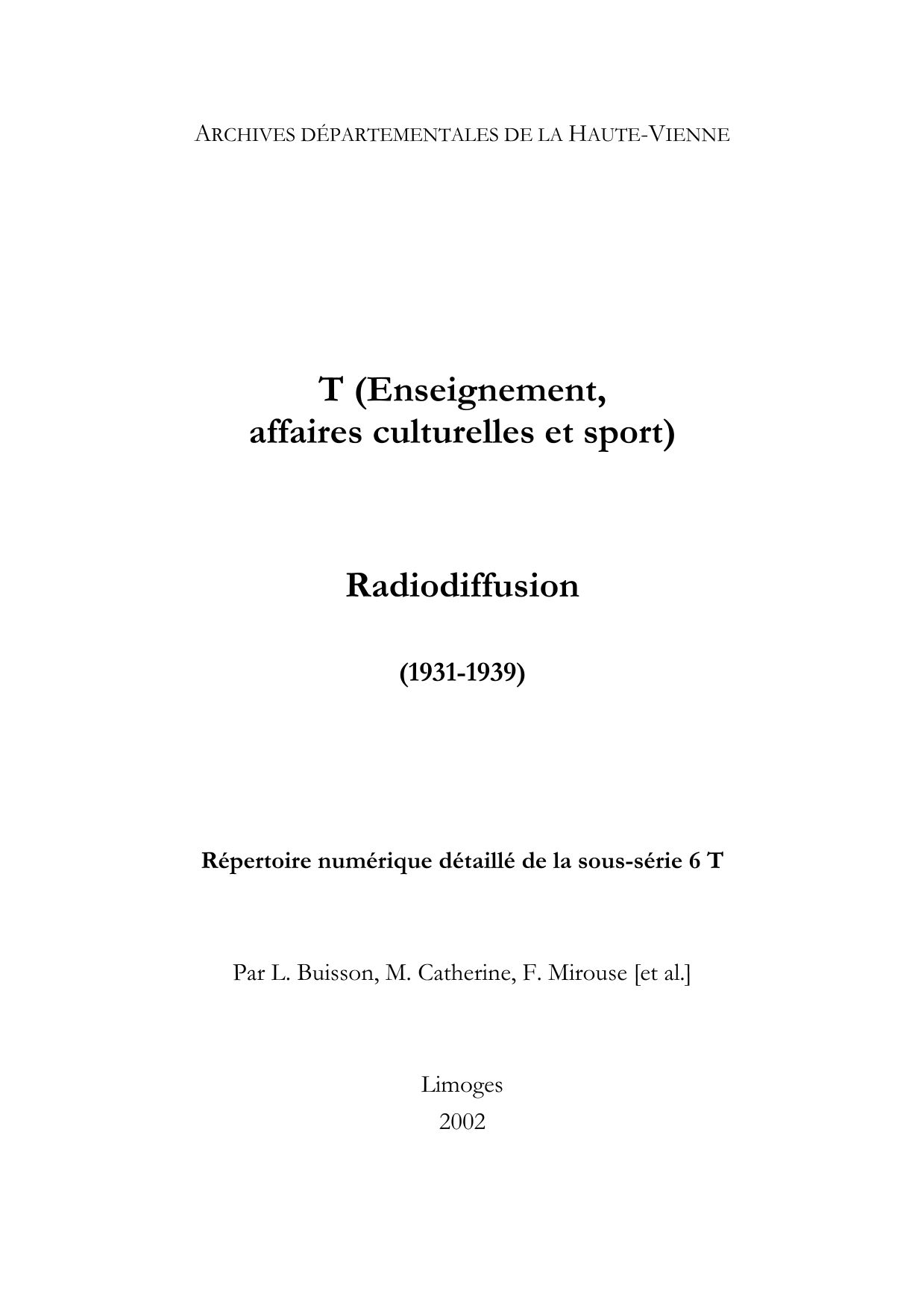 6 T. Répertoire numérique imprimé, par L. Buisson, M. Catherine, F. Mirouse, [et. Al.], Limoges, 2002, 200 p.