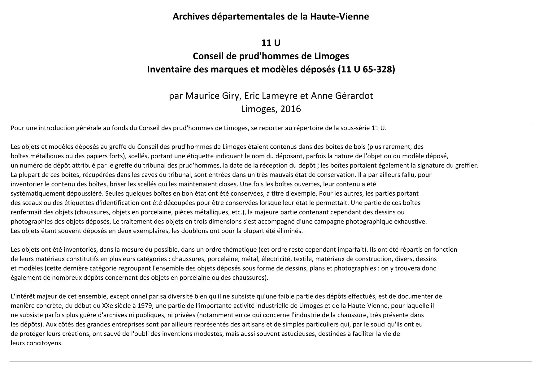 11 U 65-328. Inventaire des marques et modèles déposés, par M. Giry, E. Lameyre et A. Gérardot, 2016, 22 p. dact.