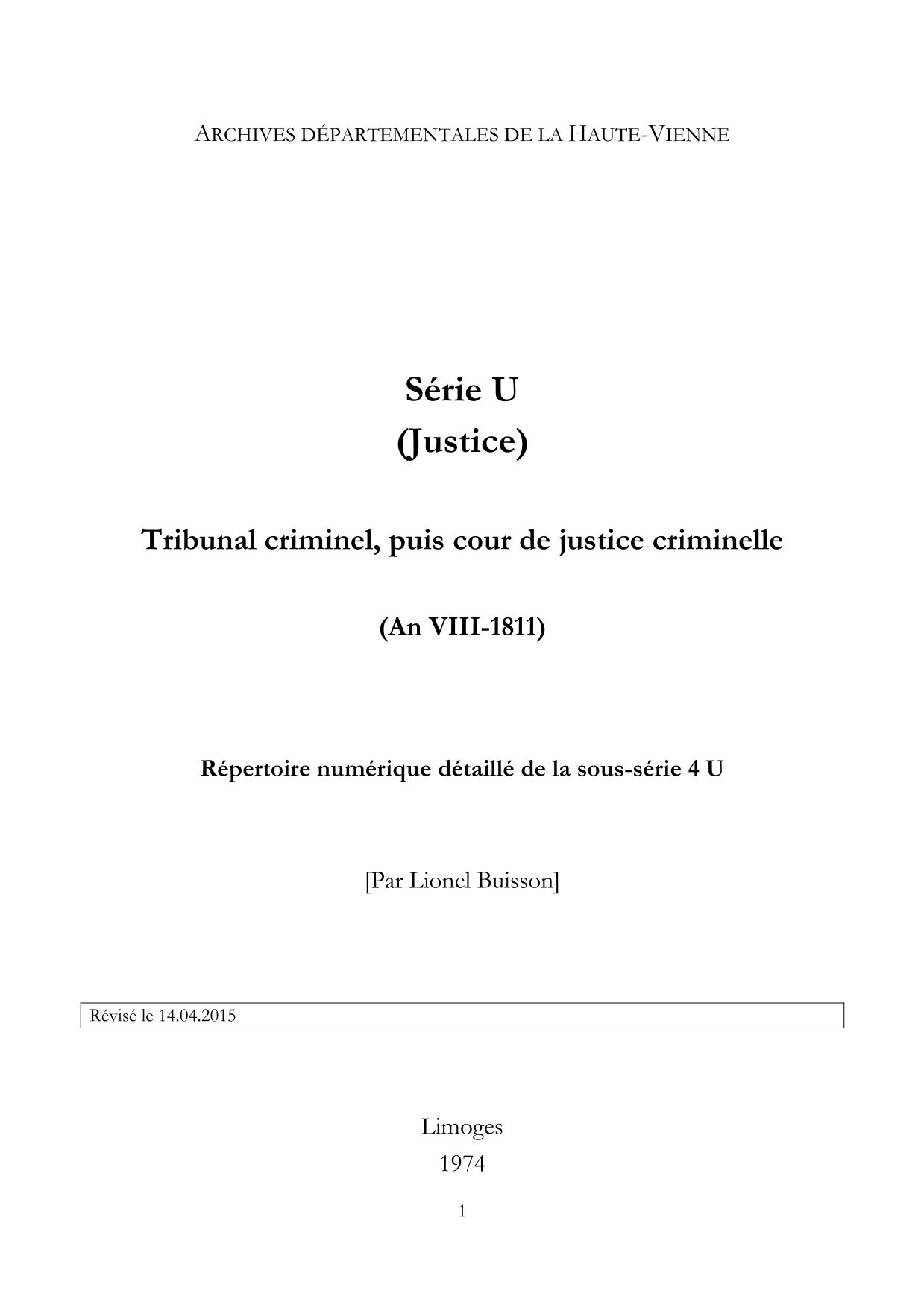 4 U. Répertoire numérique, [par L. Buisson], 1974, 4 p. dact.