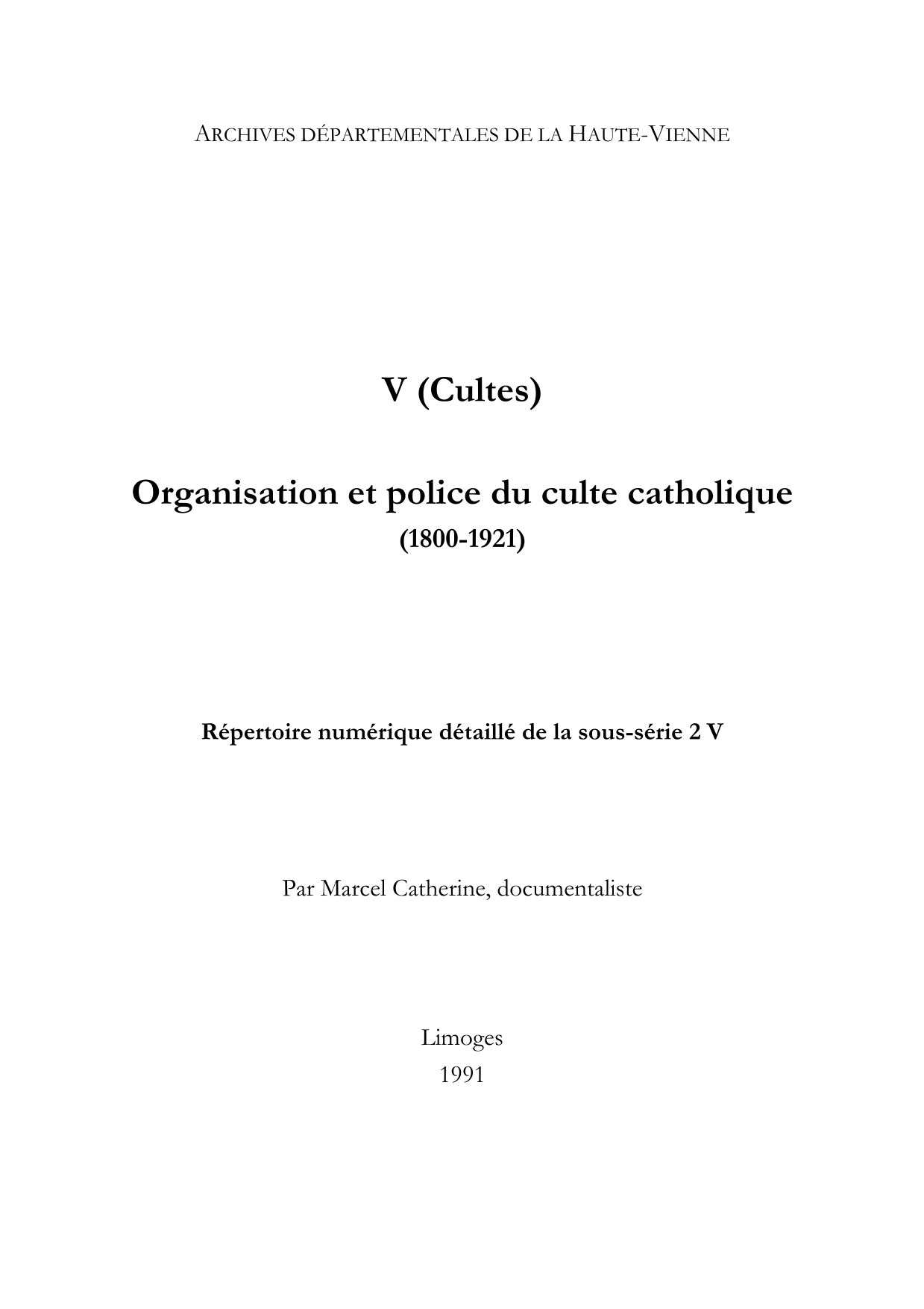 2 V. Répertoire numérique détaillé de la sous-série 2 V, par M. Catherine, 1991, 4 p. dact.