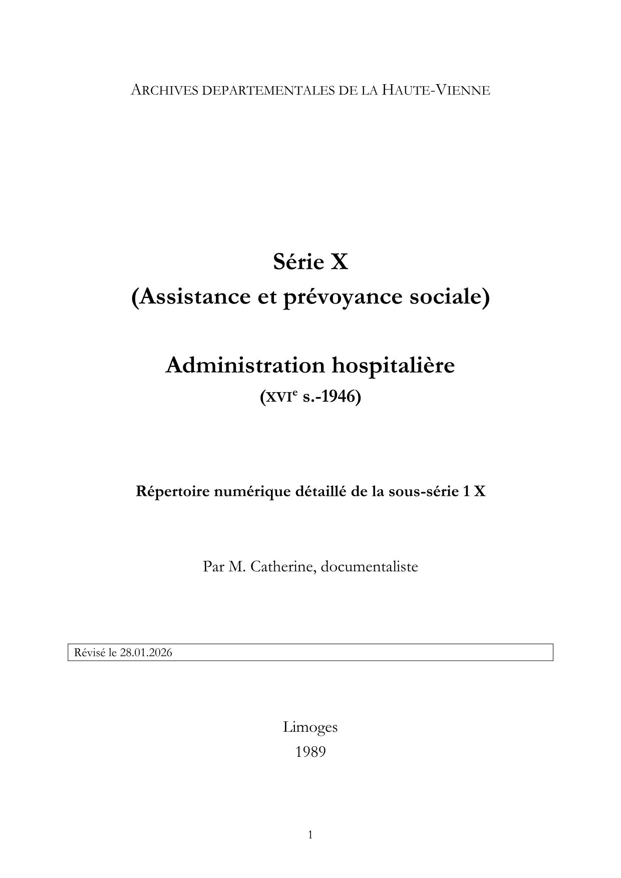 1 X. Répertoire numérique détaillé de la sous-série 1 X, par M. Catherine, 1989, 58 p. dact. X SUP. Supplément à la série X (Enfants assistés ; Pupilles ; Asile d'aliénés de Naugeat ; Inspection des enfants assistés), 10 p. dact.