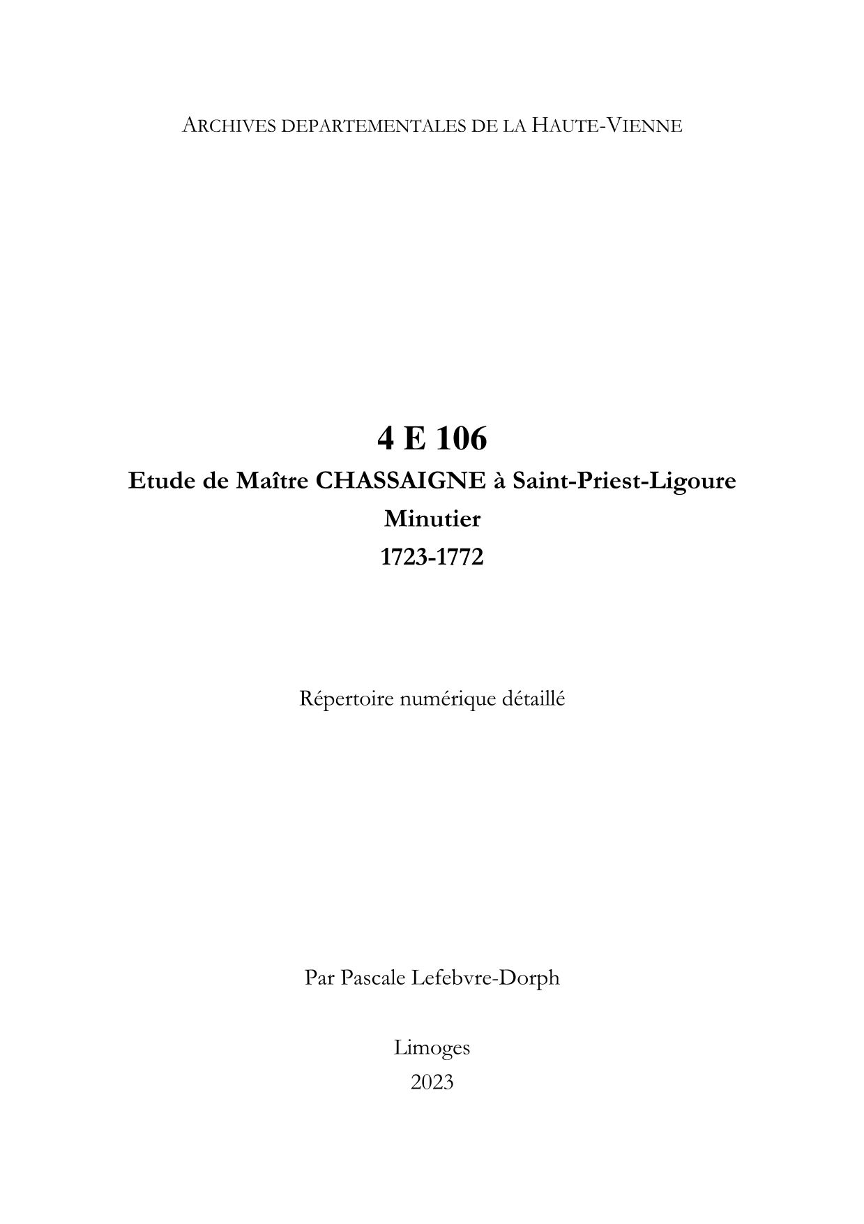 4 E 106. Etude de Maître CHASSAIGNE à Saint-Priest-Ligoure, Minutier (1723-1772), répertoire numérique détaillé, 2023, par Pascale Lefebvre-Dorph, 4 p.