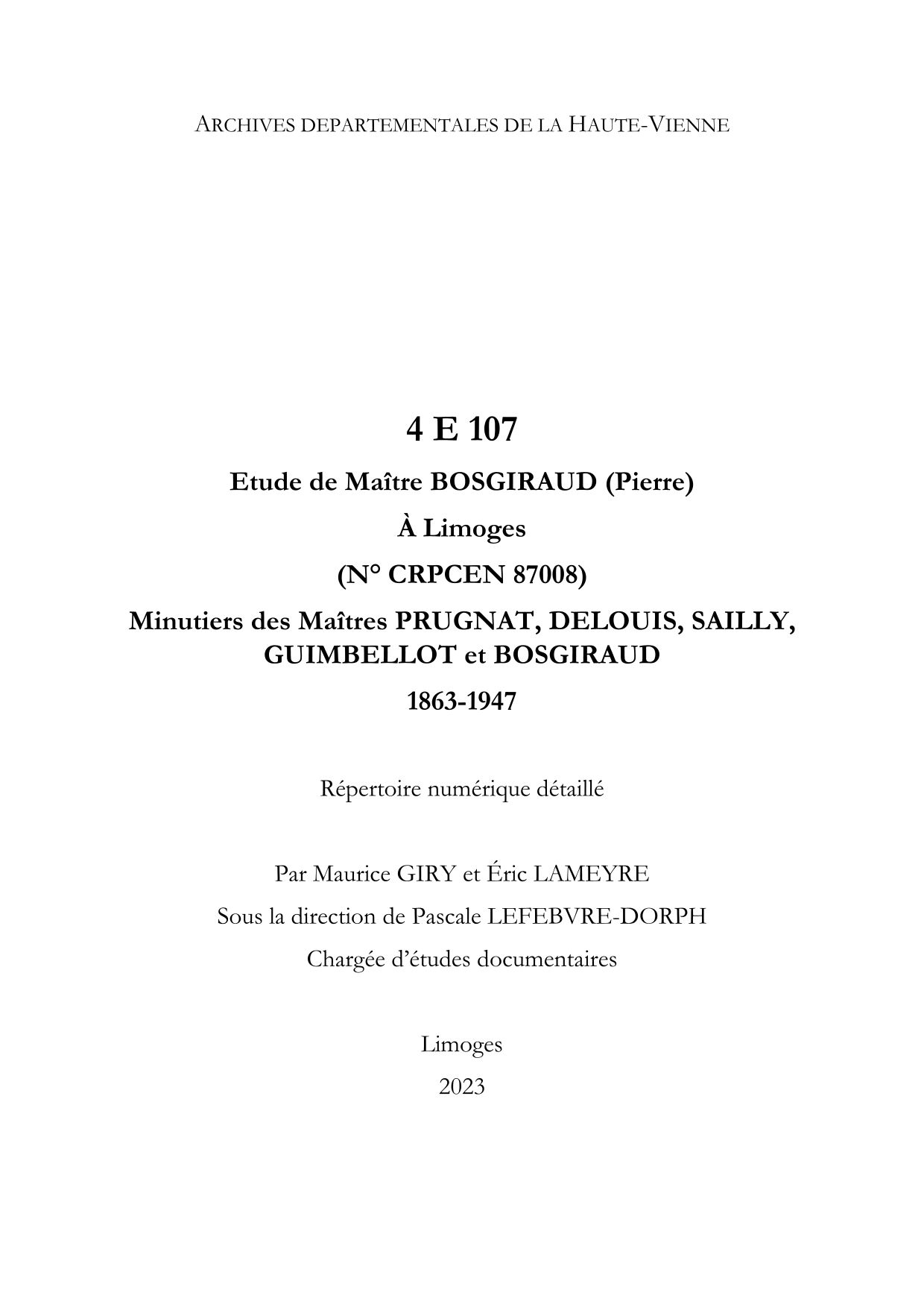 4 E 107. Etude de Maître Pierre BOSGIRAUD à Limoges, Minutiers des Maîtres PRUGNAT, DELOUIS, SAILLY, GUIMBELLOT et BOSGIRAUD (1863-1947), répertoire numérique détaillé, 2023, par Pascale Lefebvre-Dorph, 23 p.