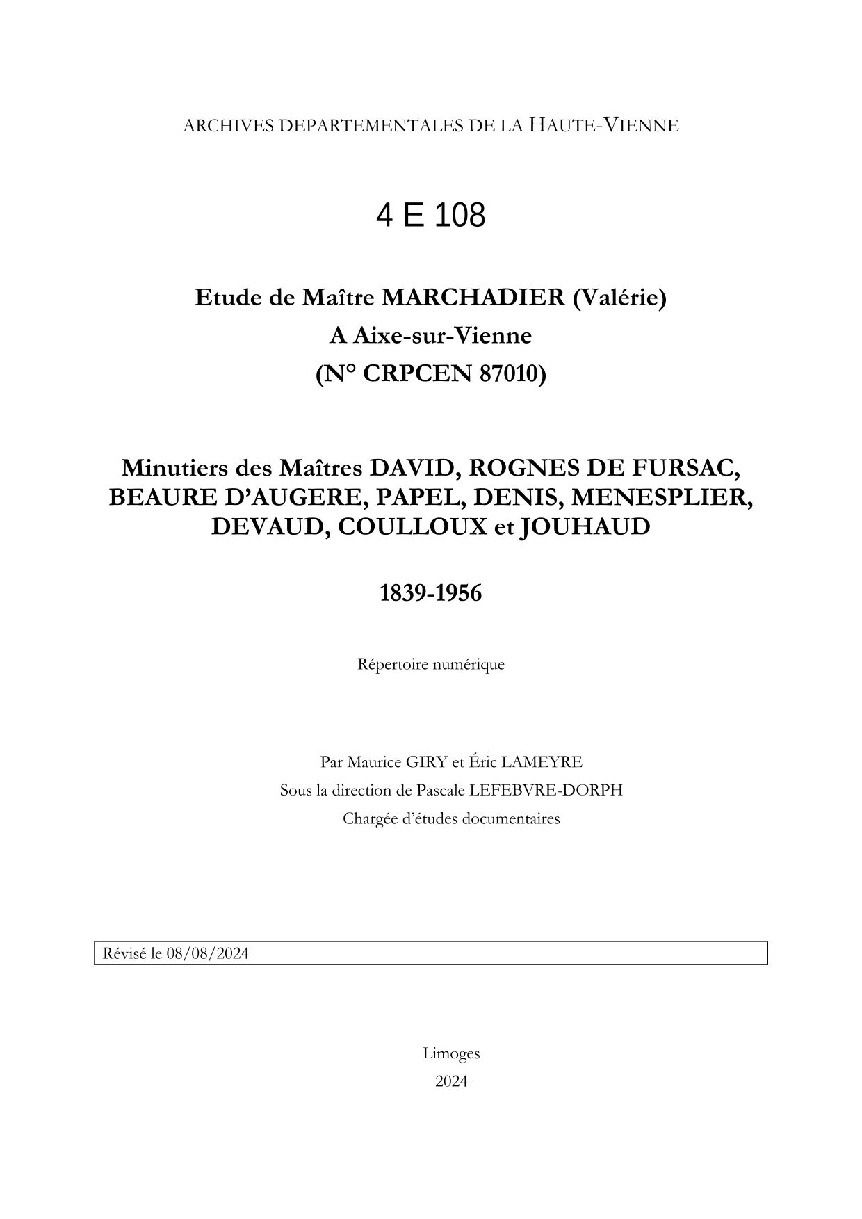 4 E 108. Etude de Maître MARCHADIER. Minutiers des Maîtres David, Rognes de Fursac, Beaure d'Augère, Papel, Denis, Menesplier, Devaud, Coulloux et Jouhaud (1839-1956), études d'Aixe-sur-Vienne et de Séreilhac, répertoire numérique, 2024, par Maurice GIRY et Éric LAMEYRE, sous la direction de Pascale LEFEBVRE-DORPH, 14 p.