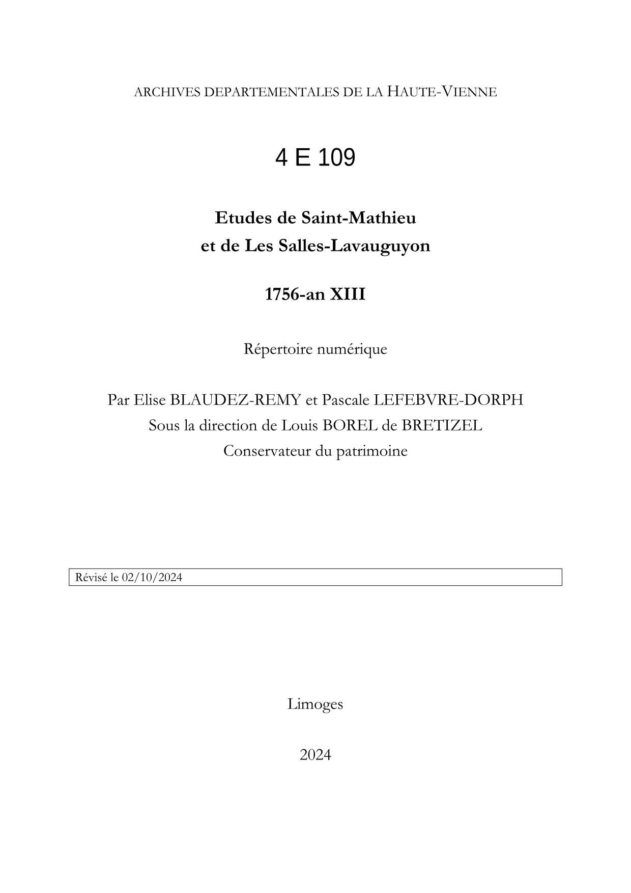 4 E 109. Etudes de Saint-Mathieu et de Les Salles-Lavauguyon (1756-an XIII), répertoire numérique, 2024, par Elise BLAUDEZ-REMY et Pascale LEFEBVRE-DORPH, sous la direction de Louis BOREL de BRETIZEL, Conservateur du patrimoine, 10 p.