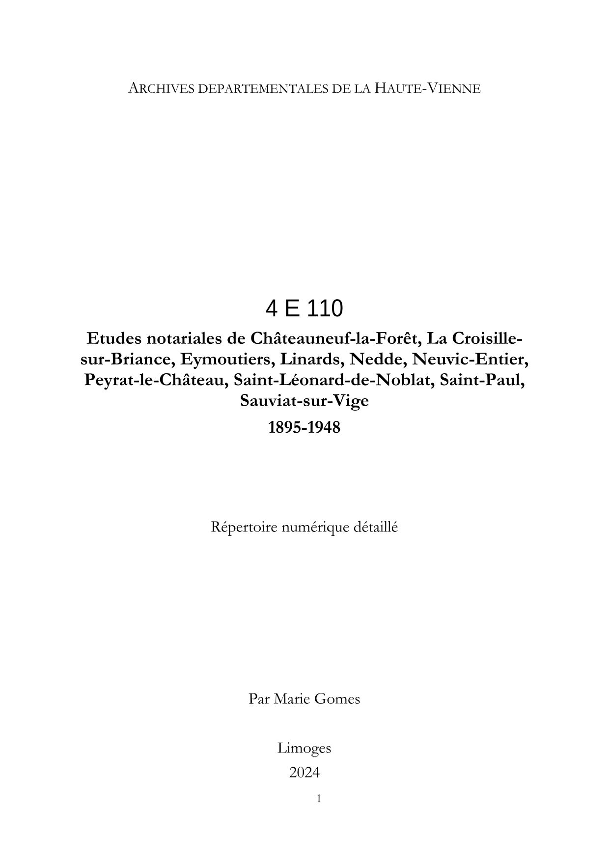 4 E 110. Études notariales de Châteauneuf-la-Forêt, La Croisille-sur-Briance, Eymoutiers, Linards, Nedde, Neuvic-Entier, Peyrat-le-Château, Saint-Léonard-de-Noblat, Saint-Paul, Sauviat-sur-Vige (1895-1948), répertoire numérique détaillé, 2024, par Marie Gomes, 45 p.