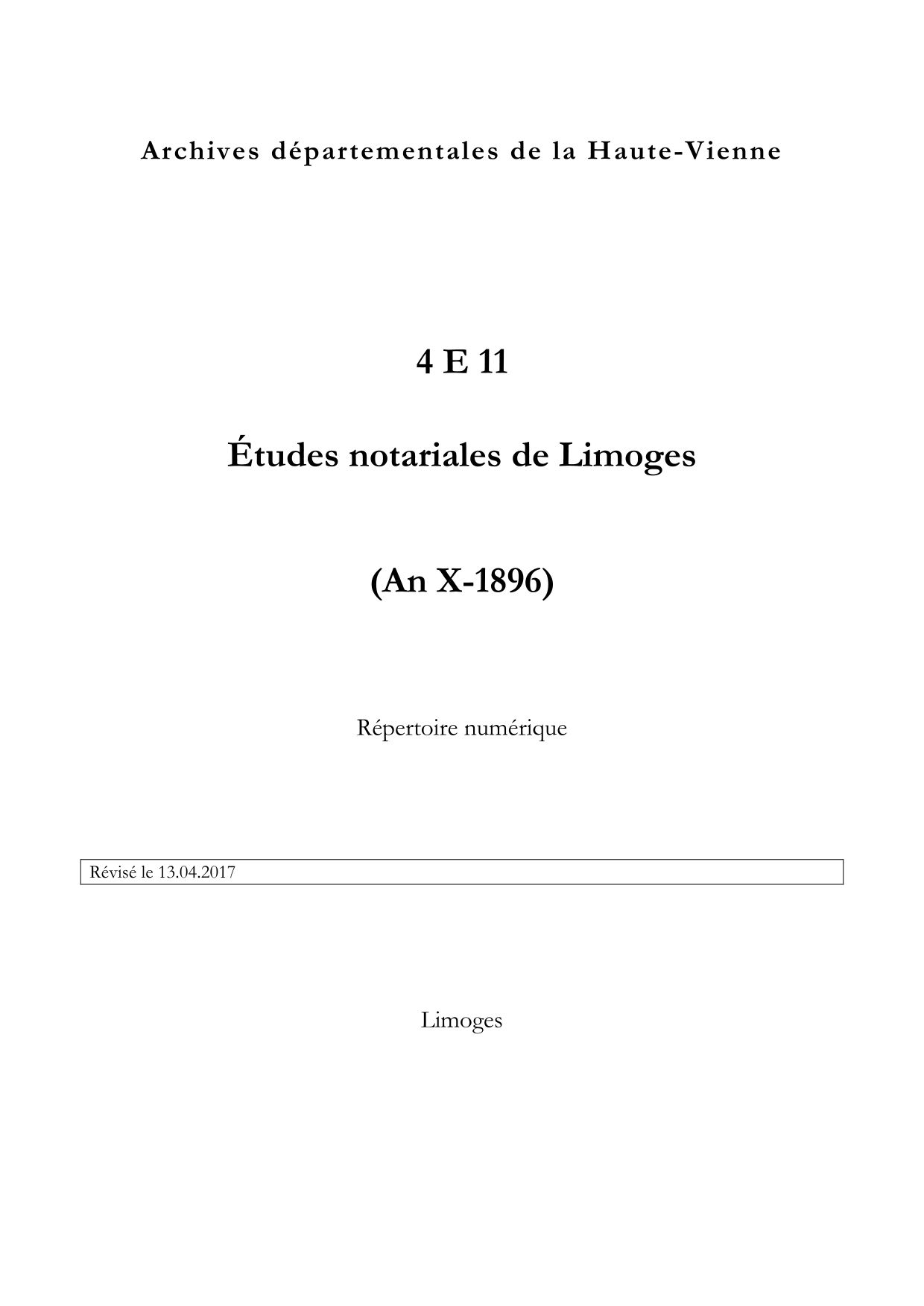 4 E 11. Études notariales de Limoges (an X-1896), répertoire numérique, s.d., repris par Karine Barreteau, 2017, 16 p.