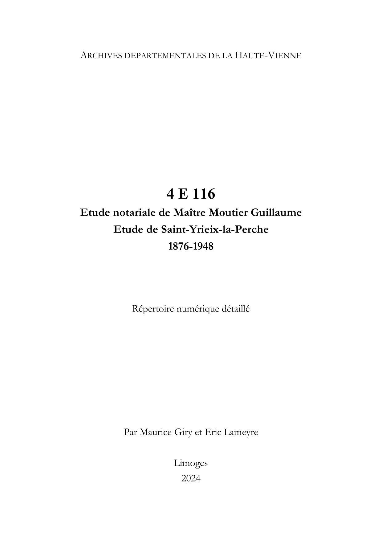 4 E 116. Etude notariale de Maître Moutier Guillaume, Etude de Saint-Yrieix-la-Perche.