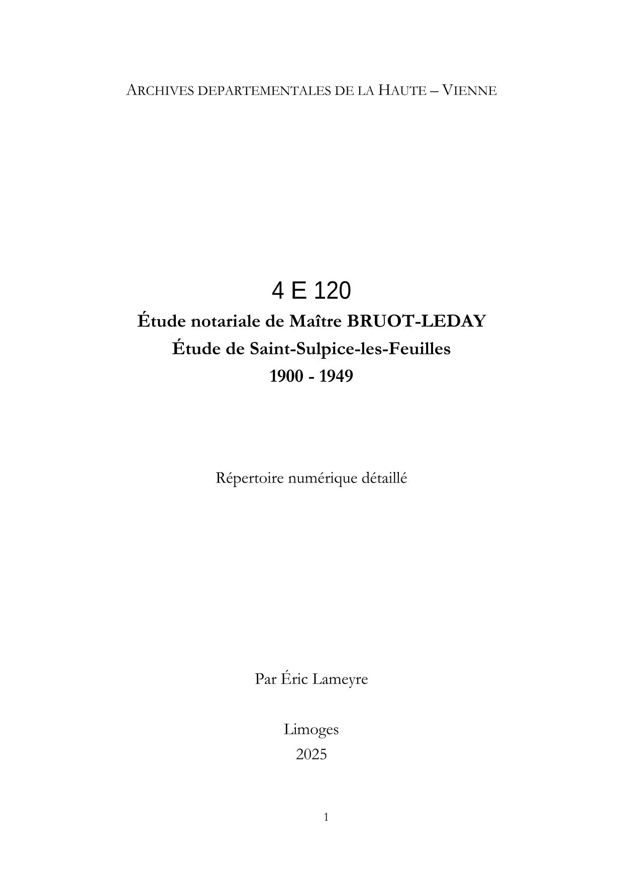 4 E 120. Étude notariale de Maître BRUOT-LEDAY, Étude de Saint-Sulpice-les-Feuilles (1900-1949). Répertoire numérique détaillé, par Eric LAMEYRE, 2025, 17 p