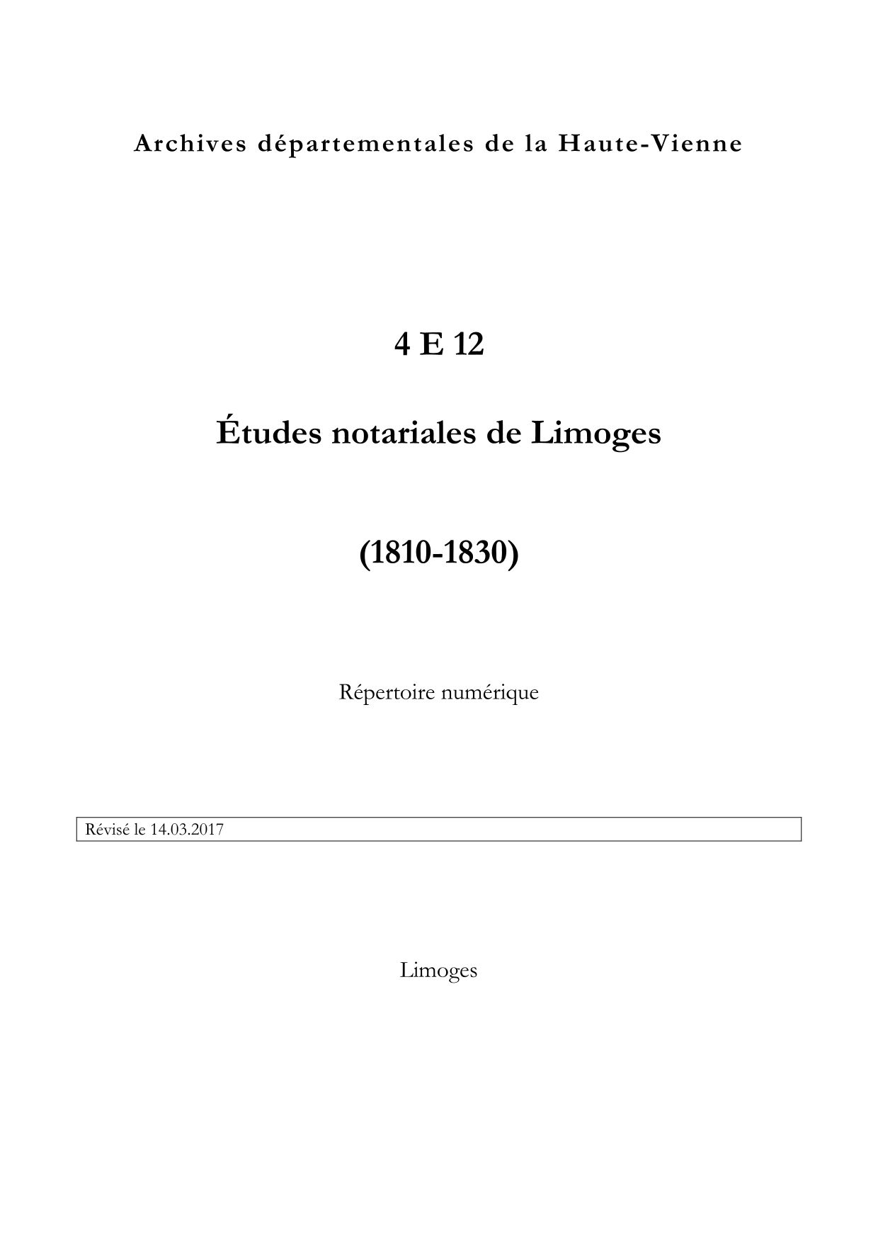 4 E 12. Études notariales de Limoges (1810-1830), répertoire numérique, s.d., repris par Karine Barreteau, 2017, 6 p.