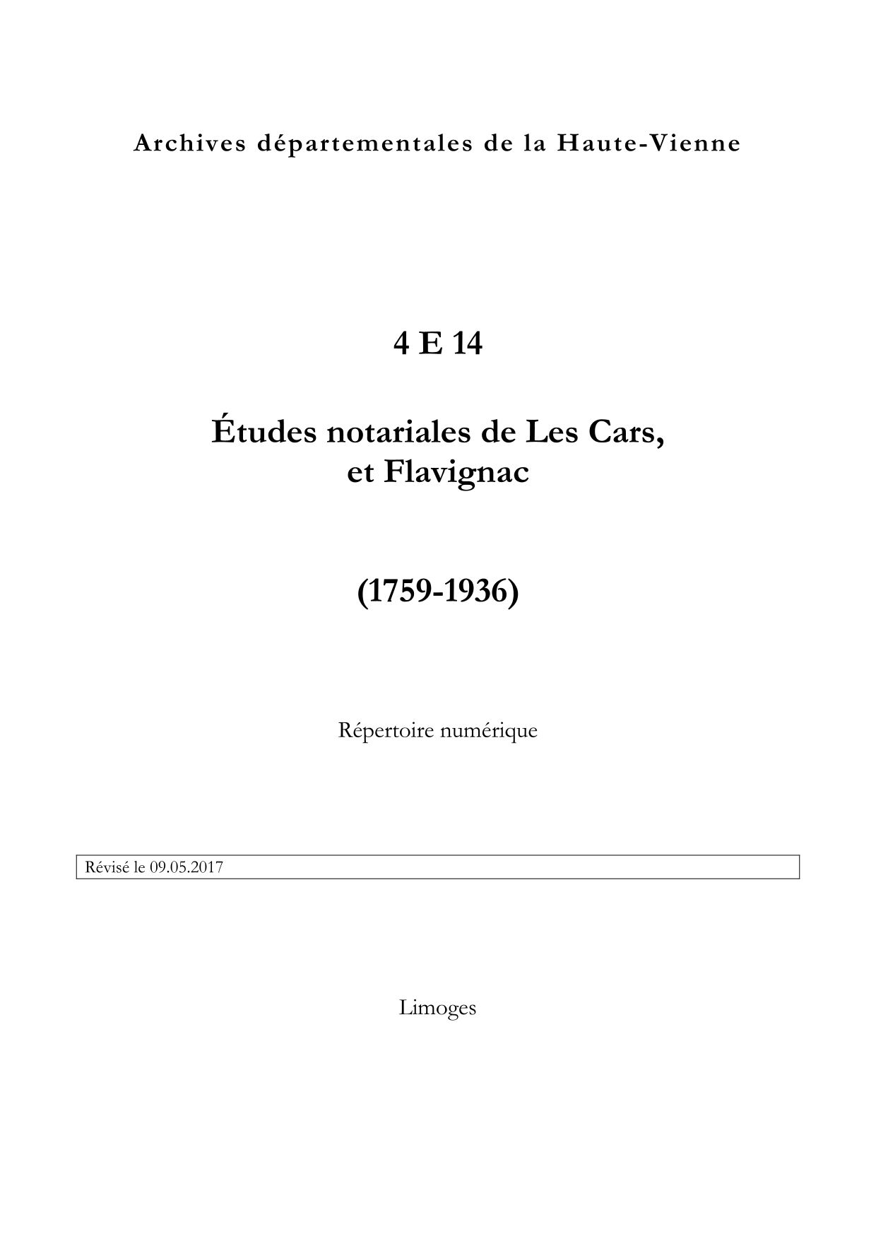 4 E 14. Études notariales de Les Cars et Flavignac (1759-1936), répertoire numérique, s.d., repris par Karine Barreteau, 2017, 18 p.