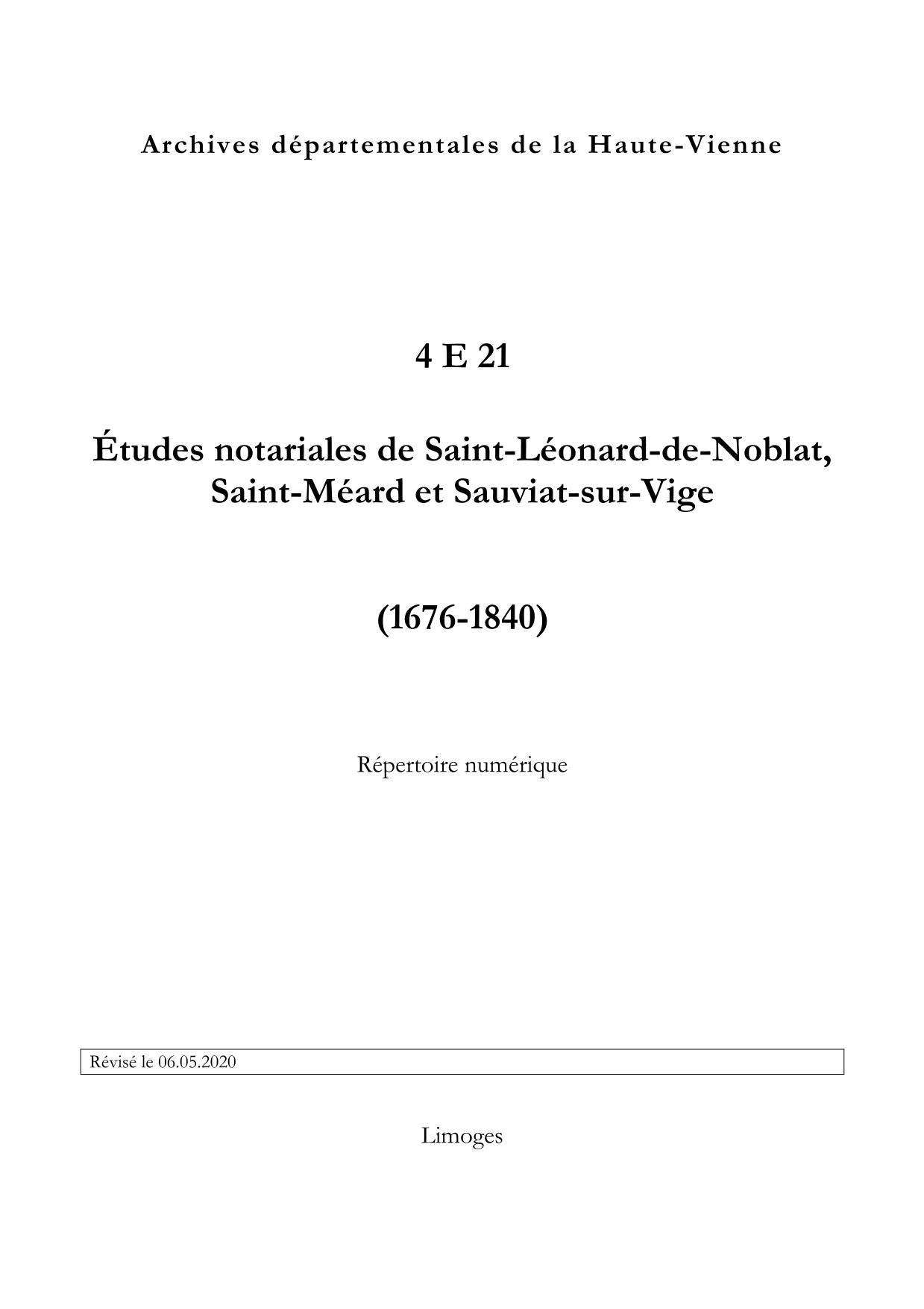4 E 21. Études notariales de Saint-Léonard-de-Noblat, Saint-Méard et Sauviat-sur-Vige, répertoire numérique, s.d., 13 p.