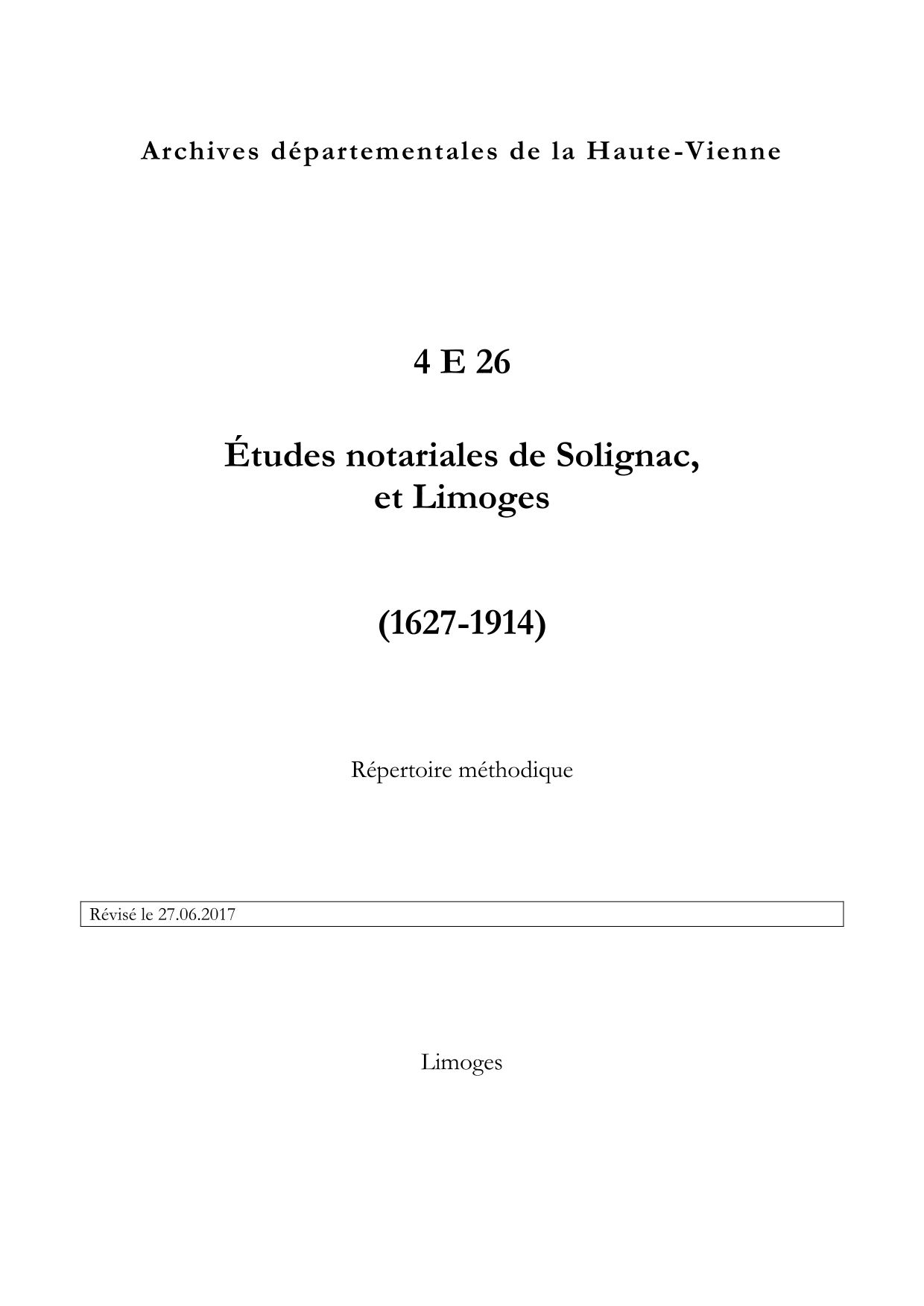 4 E 26. Études notariales de Solignac et Limoges (1627-1914), répertoire numérique, s.d., repris par Karine Barreteau, 2017, 40 p.