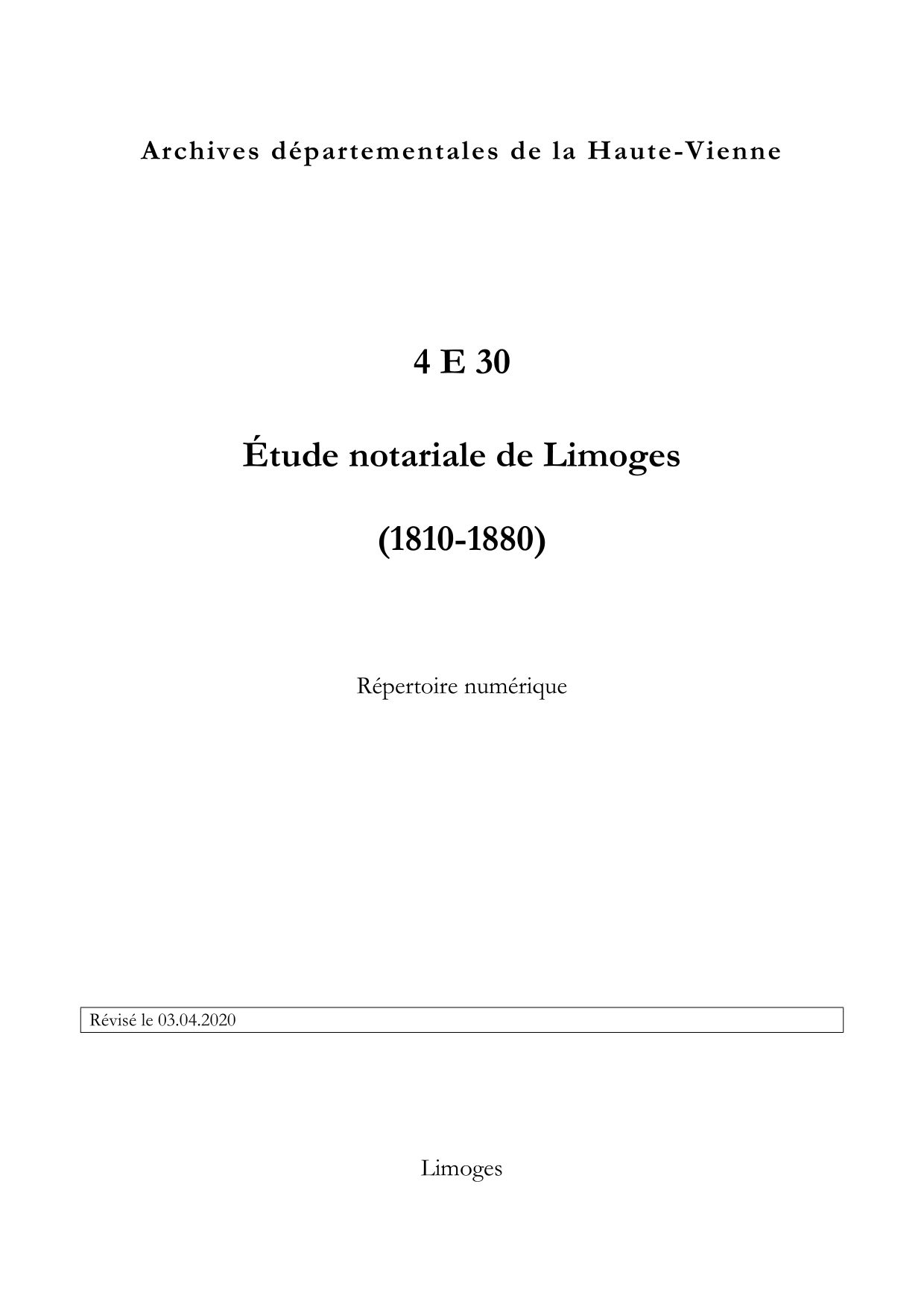 4 E 30 7,6 mètres linéaires (114 articles) 4 E 30 / 1-114 4 E 30. Étude notariale de Limoges, répertoire numérique, s.d., 9 p. Consulter l'instrument de recherche (77.0 Ko)