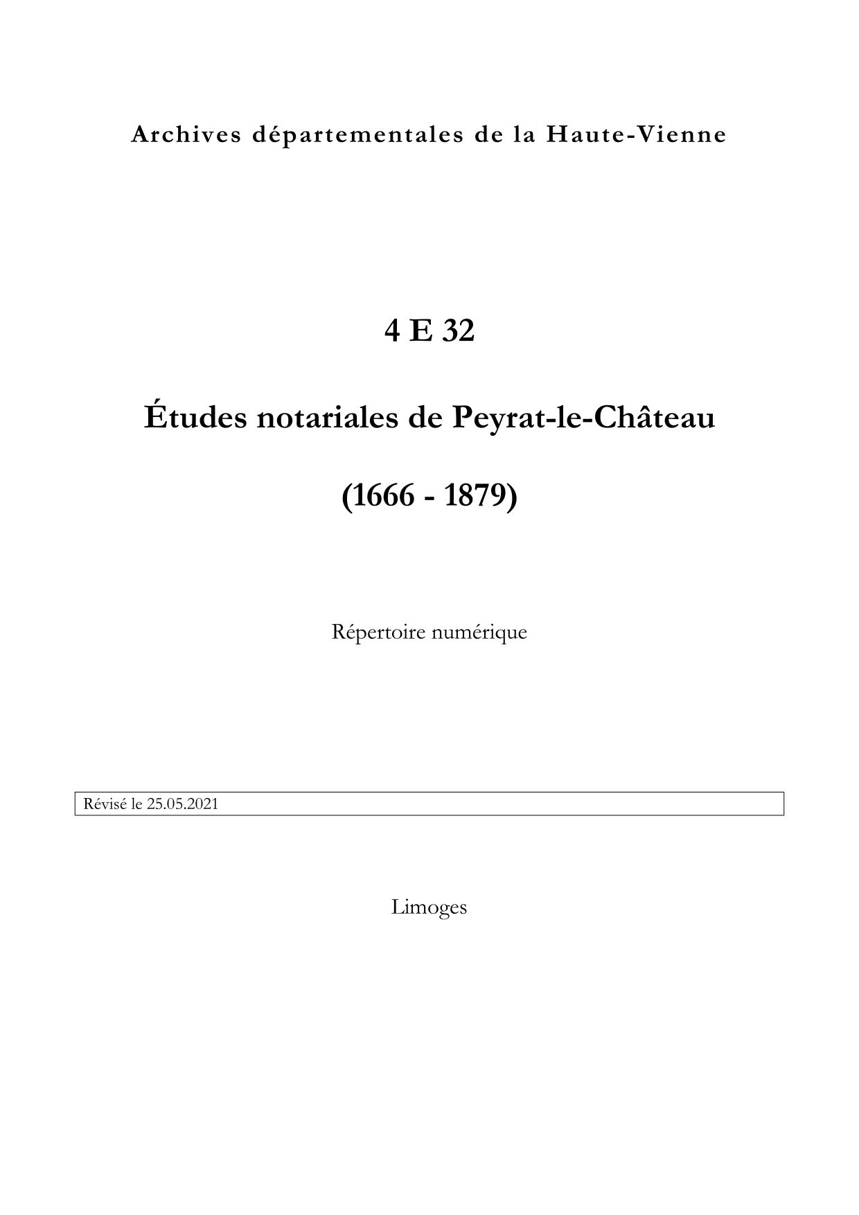 4 E 32. Études notariales de Peyrat-le-Château, répertoire numérique, s.d., 9 p.