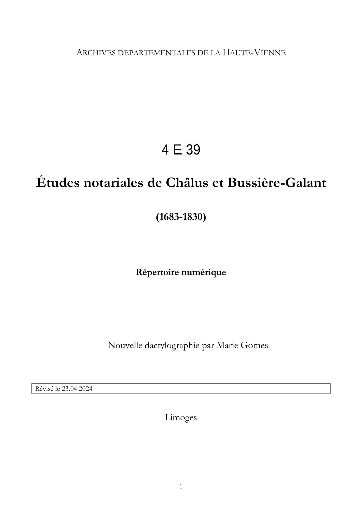 4 E 39. Études notariales de Châlus et Bussière-Galant, répertoire numérique, s.d., révisé en 2024, 10 p.