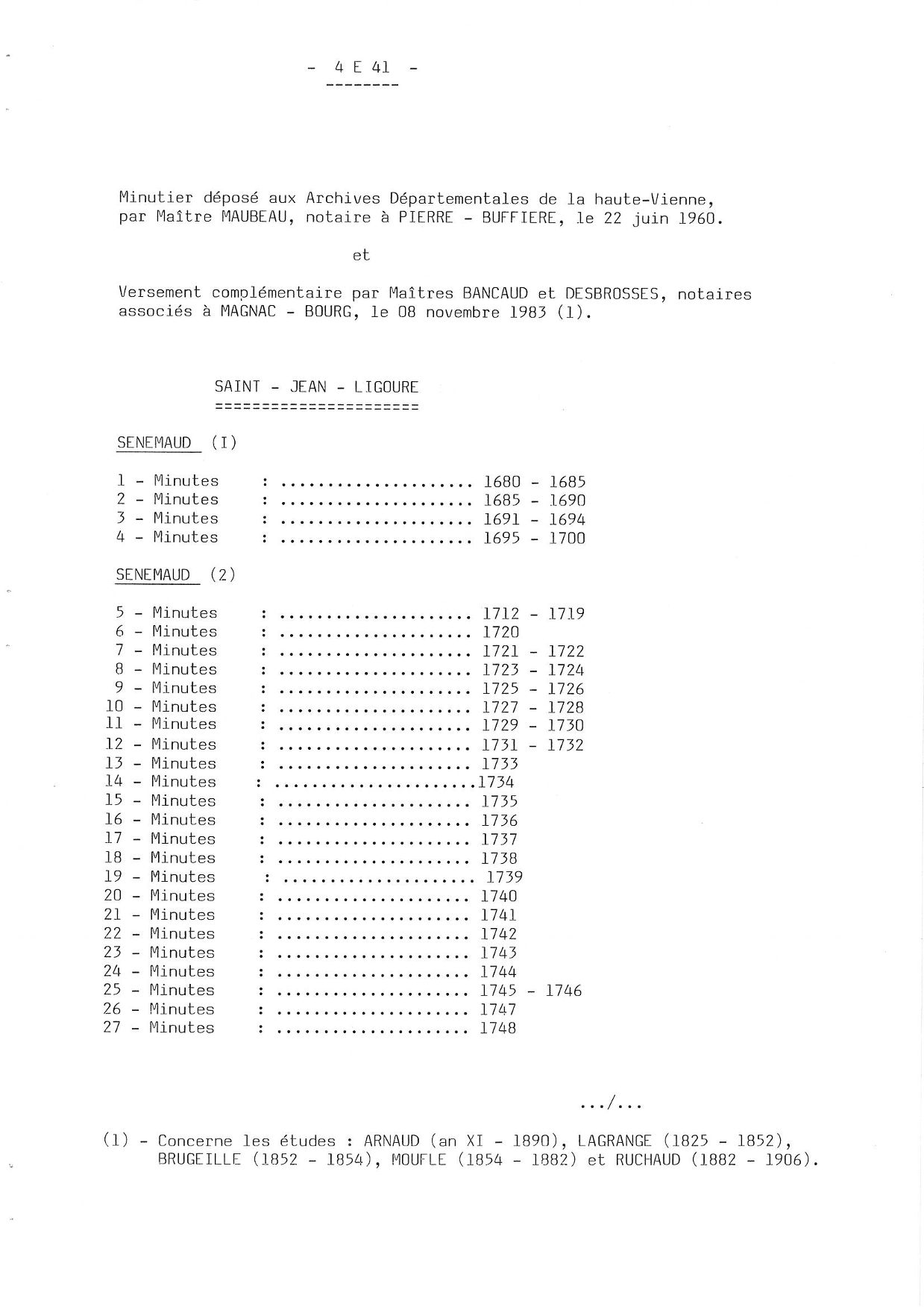 4 E 41. Études notariales de Saint-Jean-Ligoure et Pierre-Buffière, répertoire numérique, s.d., 8 p.