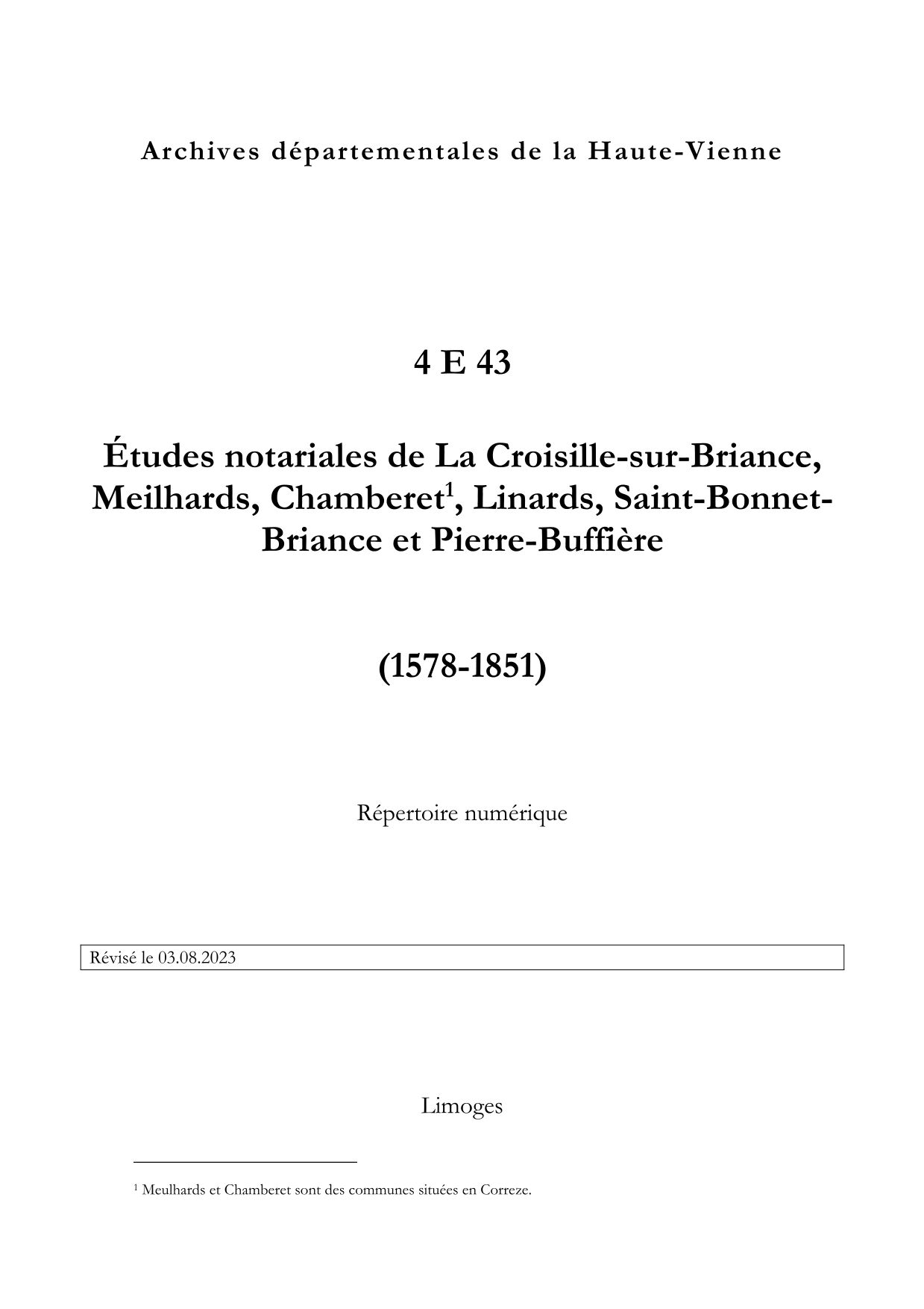 4 E 43. Études notariales de Croisille-sur-Briance, Meilhards, Chamberet, Linards, Saint-Bonnet-Briance et Pierre-Buffière (1578-1851), répertoire numérique, s.d., repris par Karine Barreteau, 2017, révisé en 2023, 22 p.