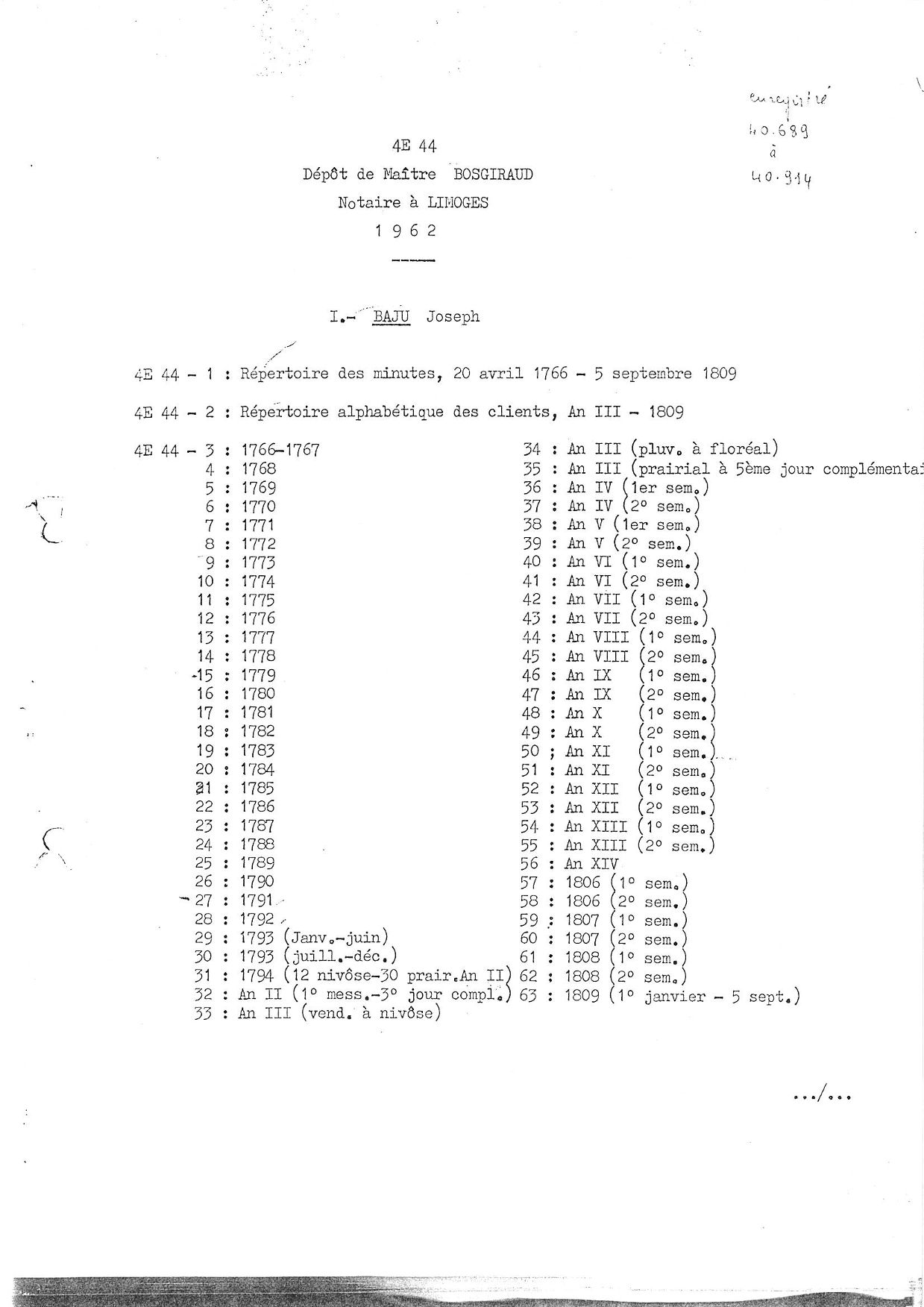 4 E 44. Études notariales de Limoges (Maîtres Joseph Baju, Martial Baju, Prugnat, Delouis) (1766-1912), répertoire numérique, s.d., dactylographié, 3 p.