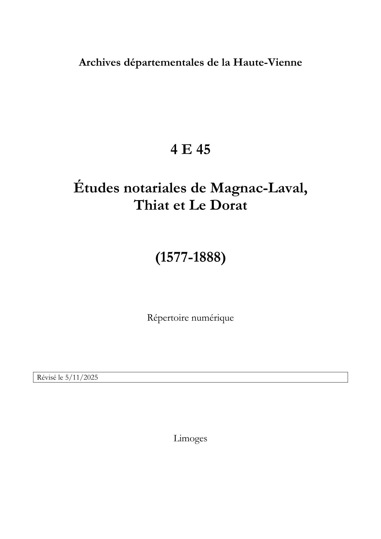 4 E 45. Études notariales de Magnac-Laval, Thiat et Le Dorat, répertoire numérique, s.d., repris par Karine Barreteau, 2017, 27 p., révisé en 2025.
