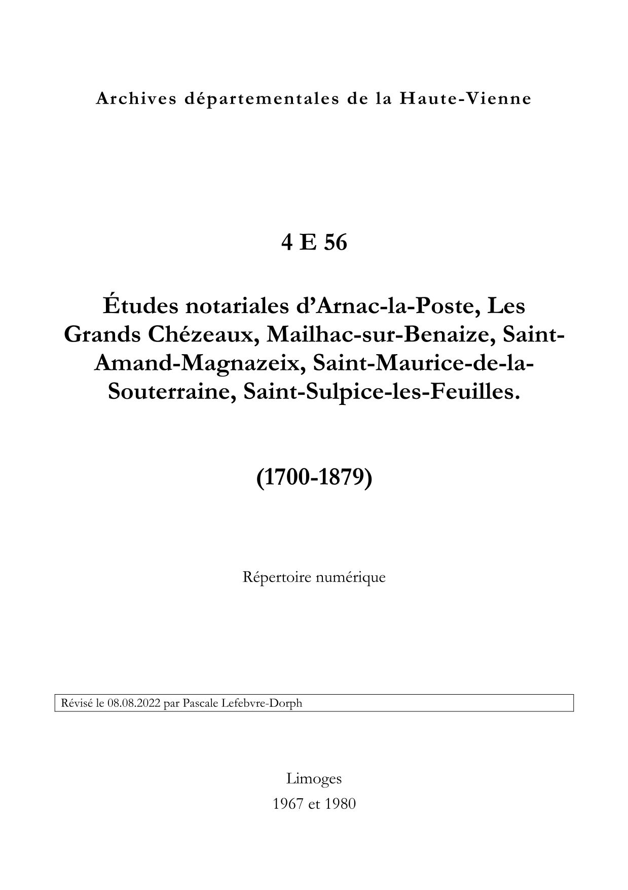 4 E 56. Études notariales d’Arnac-la-Poste, Les Grands Chézeaux, Mailhac-sur-Benaize, Saint-Amand-Magnazeix, Saint-Maurice-de-la-Souterraine, et Saint-Sulpice-les-Feuilles, répertoire numérique, 1967 et 1980, révisé par Pascale Lefebvre-Dorph, 2022, 11 p.