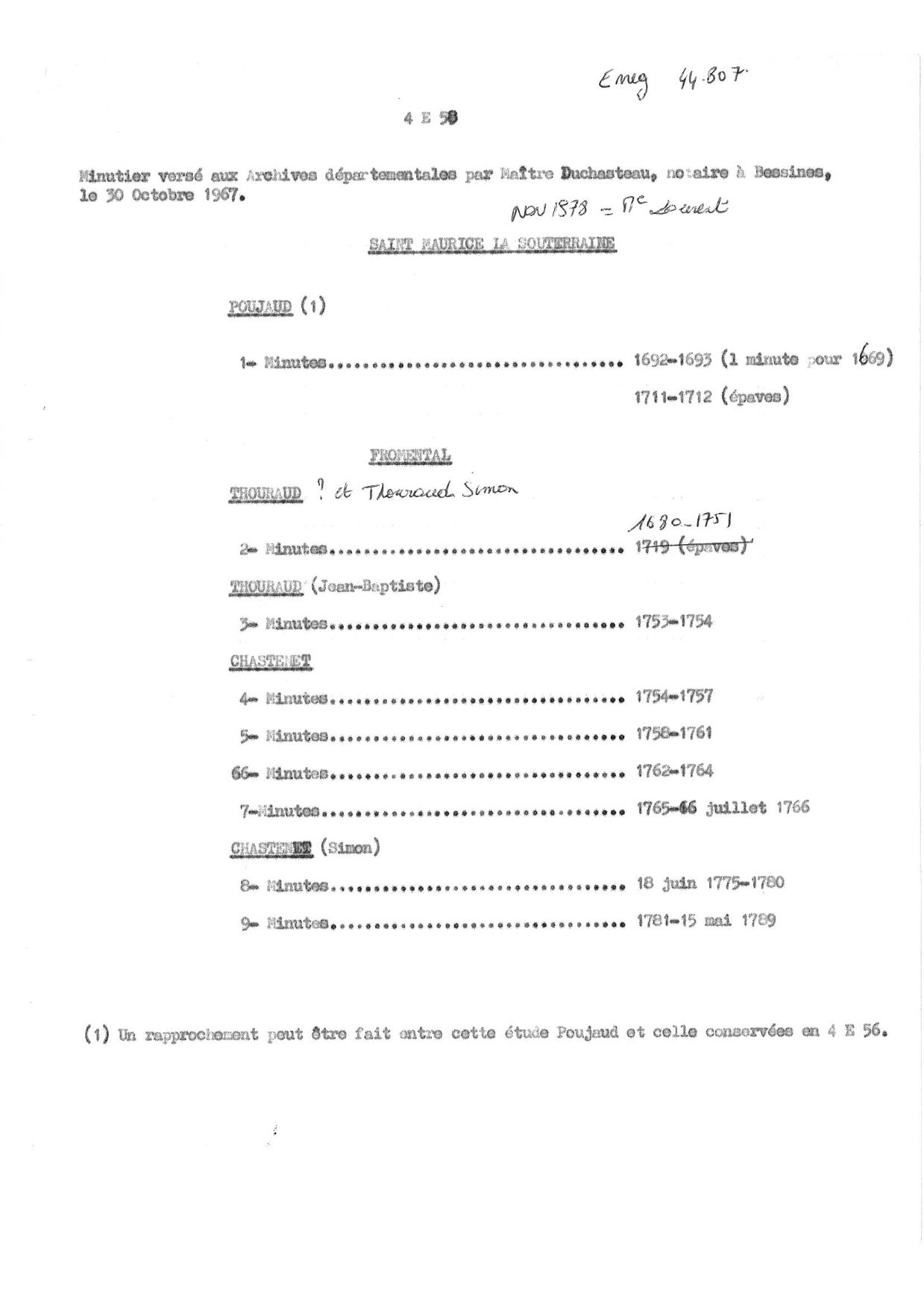 4 E 58. Études notariales de Bessines-sur-Gartempe, Morterolles-sur-Semme, Razès, Saint-Amand-Magnazeix, Saint-Maurice-la-Souterraine, répertoire numérique, s.d., dactylographié, 5 p.