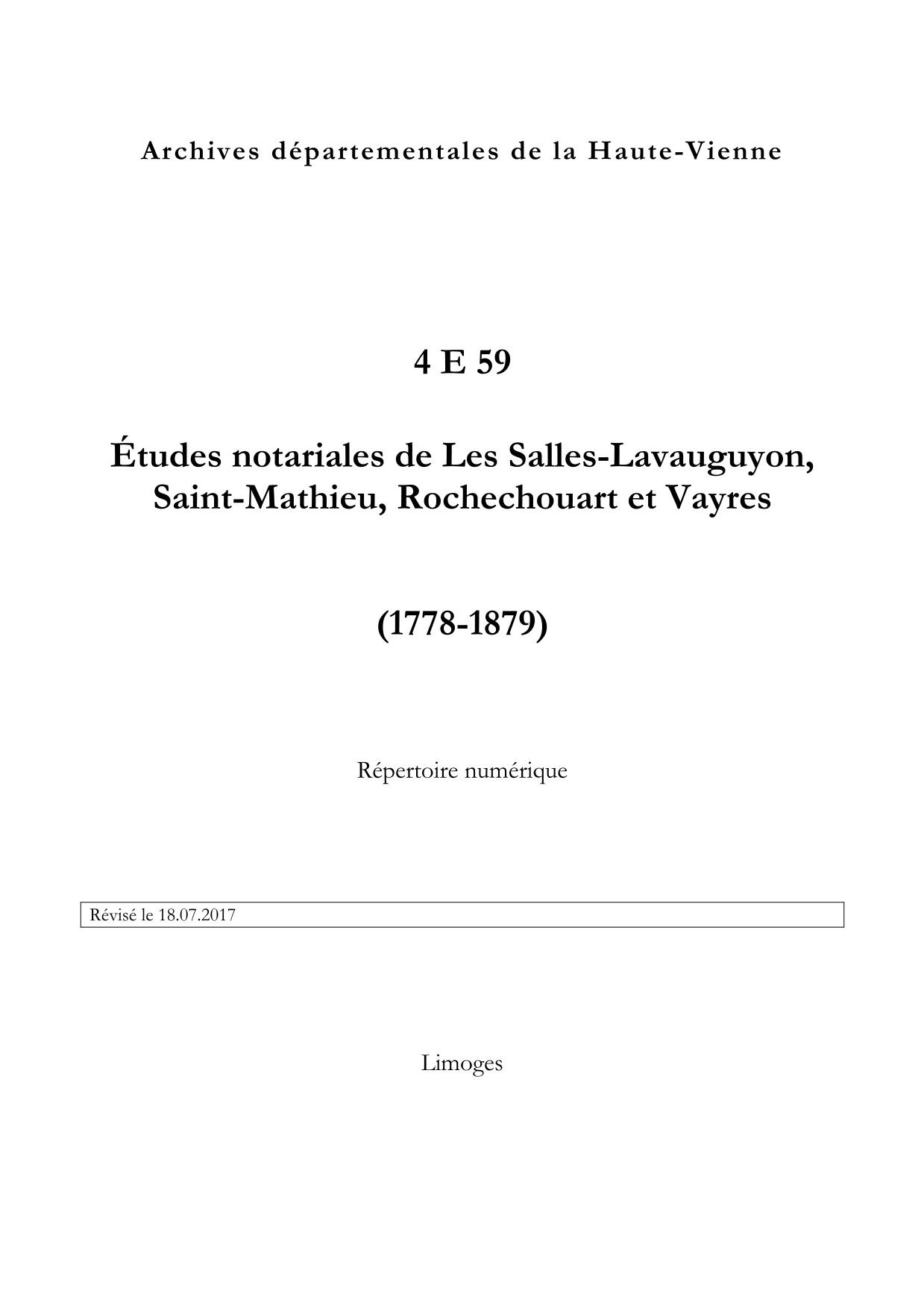 4 E 59. Études notariales de Les Salles-Lavauguyon, Saint-Mathieu, Rochechouart et Vayres (1778-1879), répertoire numérique, s.d., révisé en 2017, 16 p.