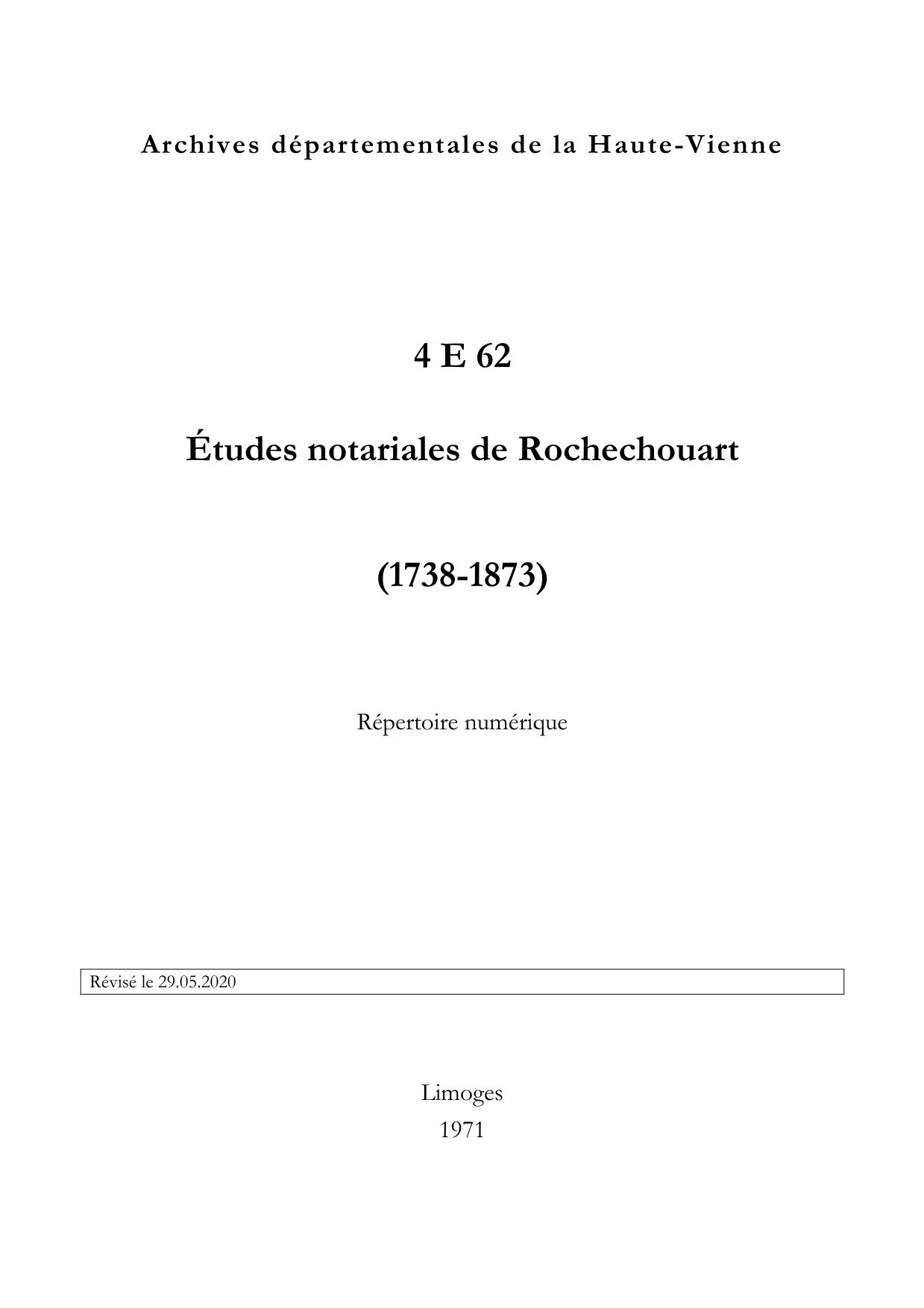 4 E 62. Études notariales de Rochechouart, répertoire numérique, 1971, révisé en 2020, 10 p.