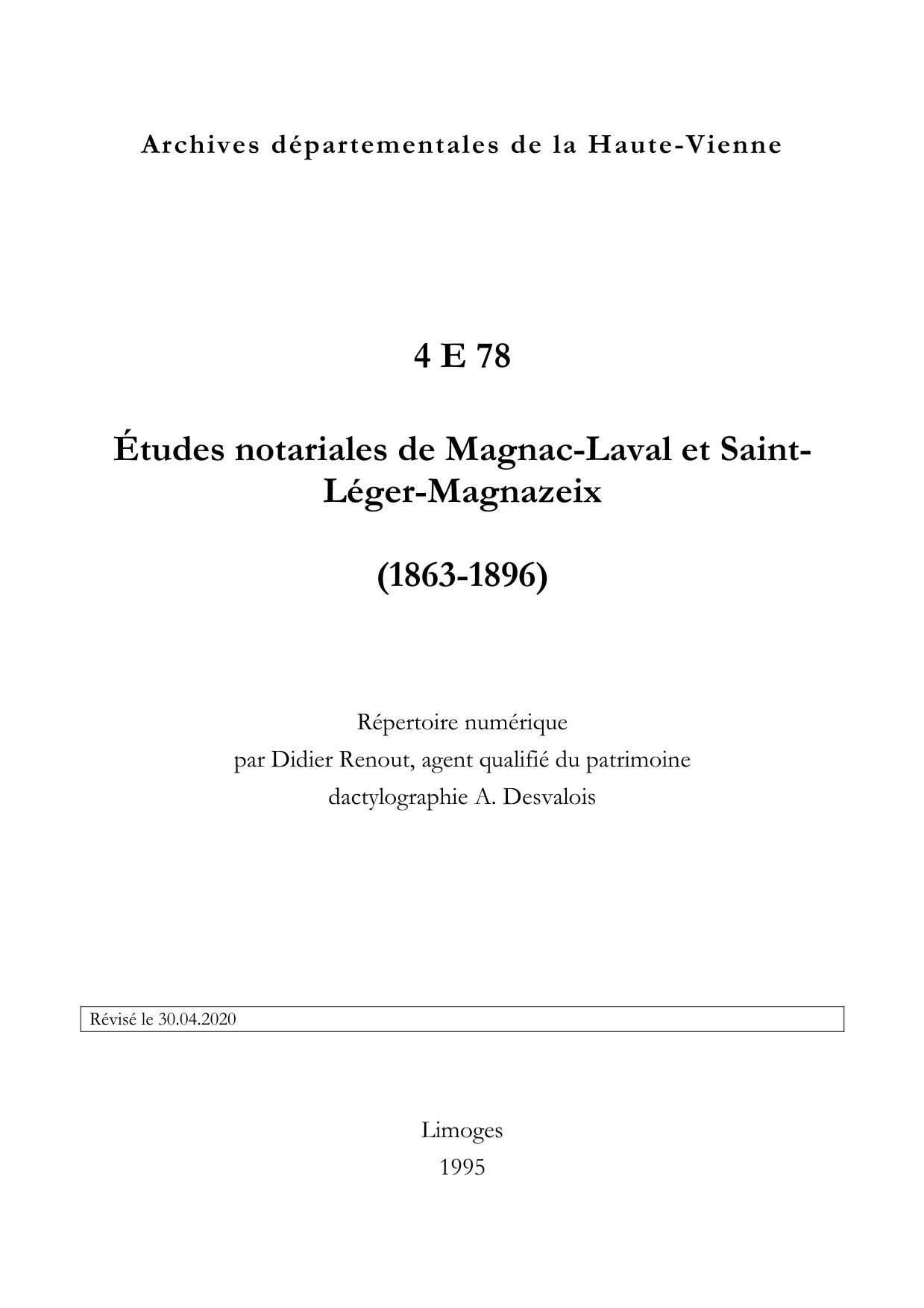 4 E 78. Études notariales de Magnac-Laval et Saint-Léger-Magnazeix, répertoire numérique, 1995, par Didier Renout, 19 p.
