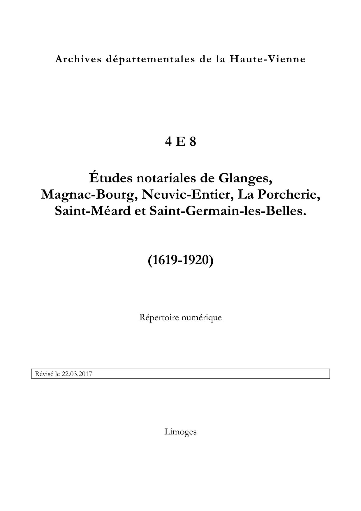 4 E 8. Études notariales de Glanges, Magnac-Bourg, Neuvic-Entier, La Porcherie, Saint-Méard et Saint-Germain-les-Belles, répertoire numérique, s.d., repris par Karine Barreteau, 2017, 33 p.