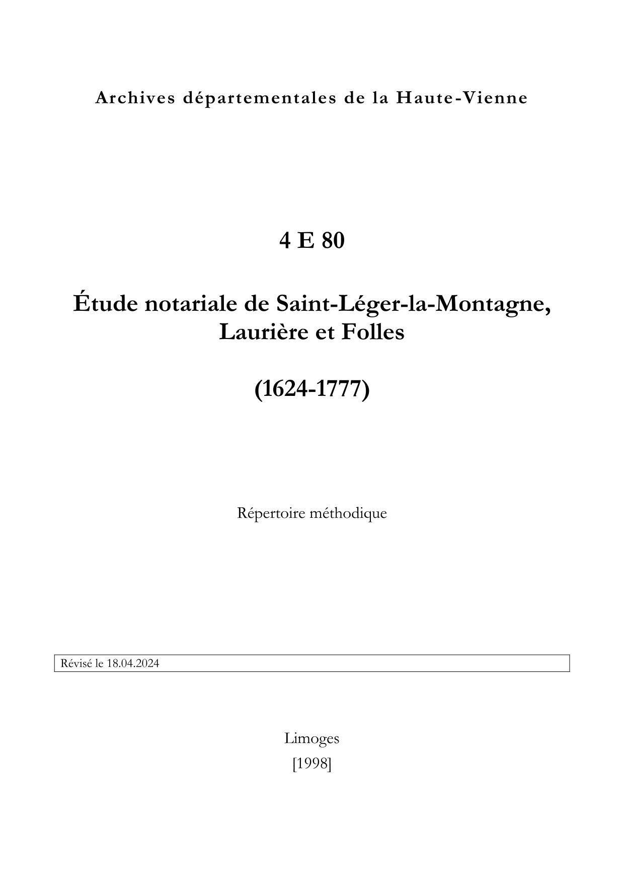 4 E 80. Études notariales de Saint-Léger-la-Montagne, Laurière et Folles, répertoire numérique, [1998], révisé par Pascale Lefebvre-Dorph, 2024, 5 p.