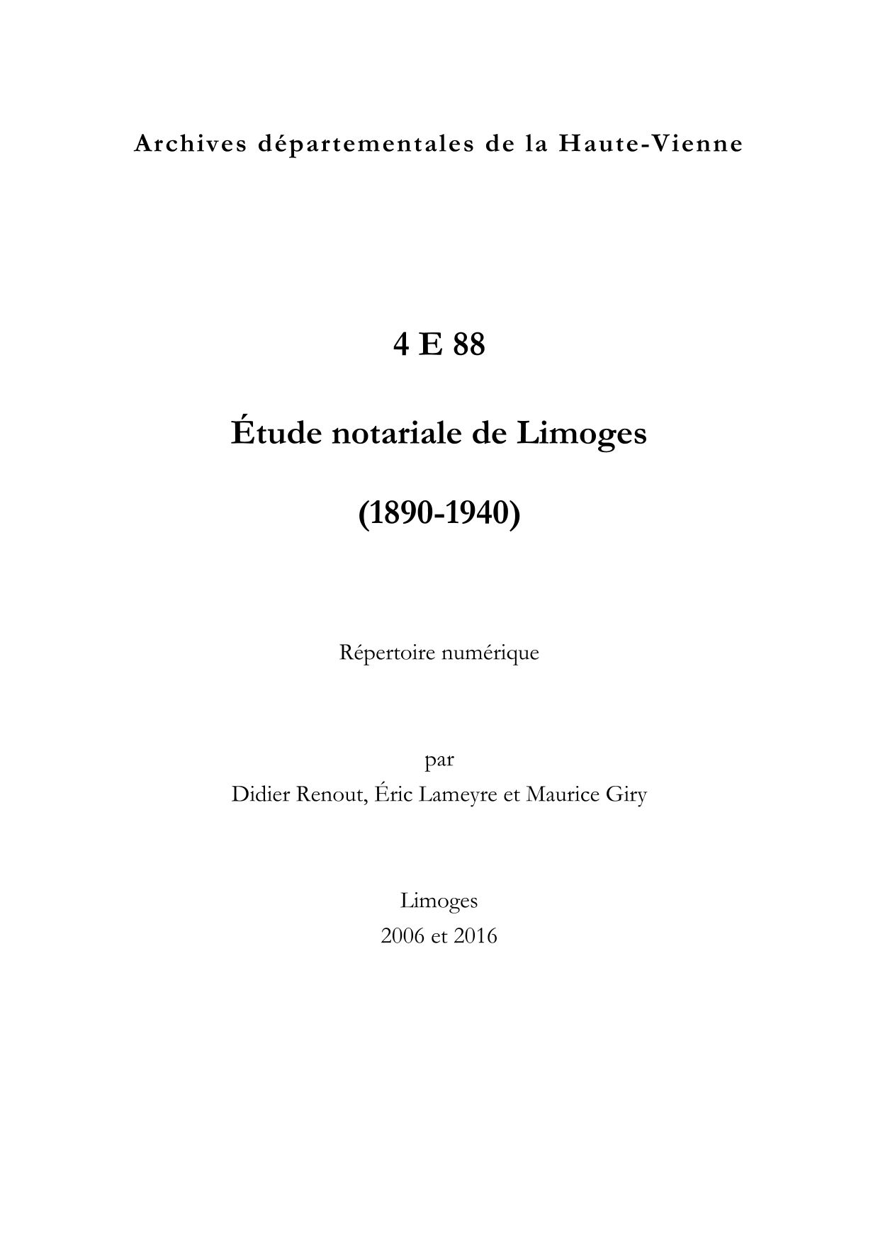 4 E 88. Étude notariale de Limoges, répertoire numérique par Didier Renout, Maurice Giry et Éric Lameyre, 2006 et 2016, 21 p.