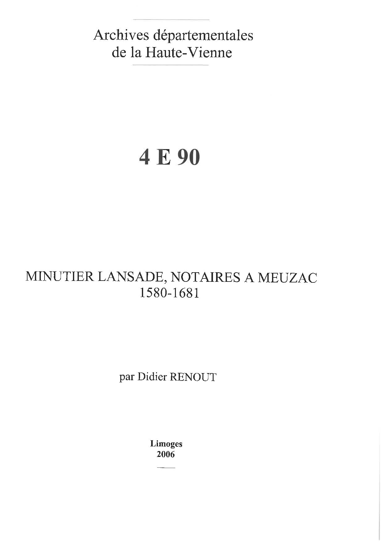 4 E 90. Minutier Lansade, notaires à Meuzac, répertoire numérique, 2006, par Didier Renout, 5 p.