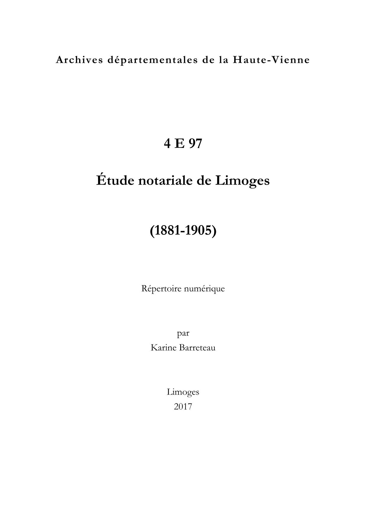 4 E 97. Étude notariale de Limoges, répertoire numérique par Karine Barreteau, 2017, 8 p.