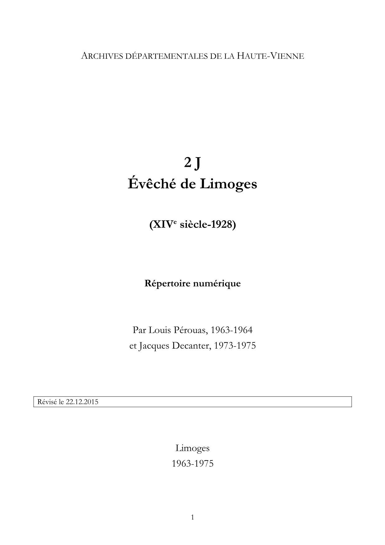 2 J. Répertoire numérique, par L. Pérouas, 1963-1964, et J. Decanter, 1973-1975, 100 p. dact. Comporte une table des visites pastorales qui subsistent pour les années 1897-1935.