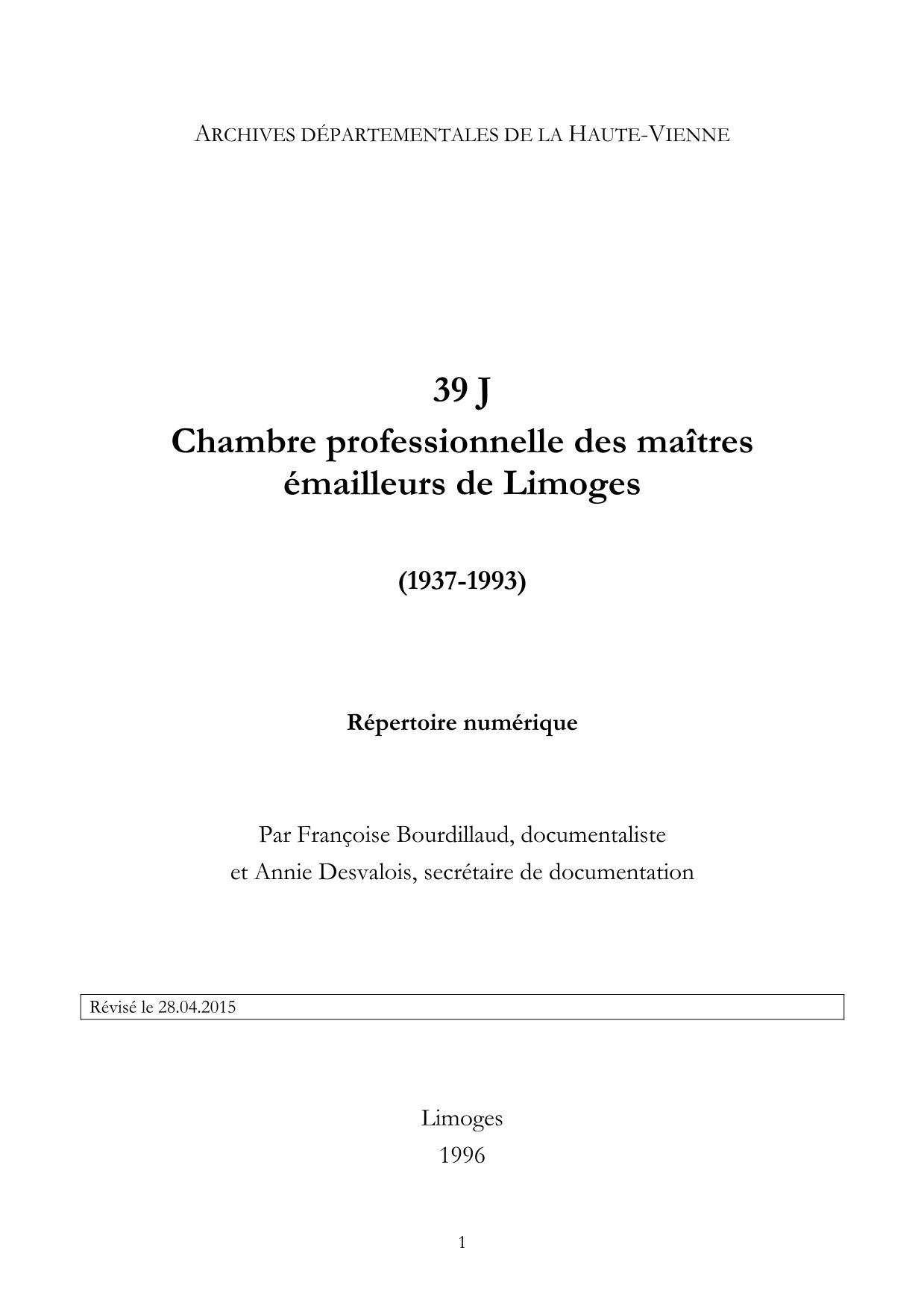 39 J. Répertoire numérique, par F. Bourdillaud et A. Desvalois, 1996, 6 p. dact