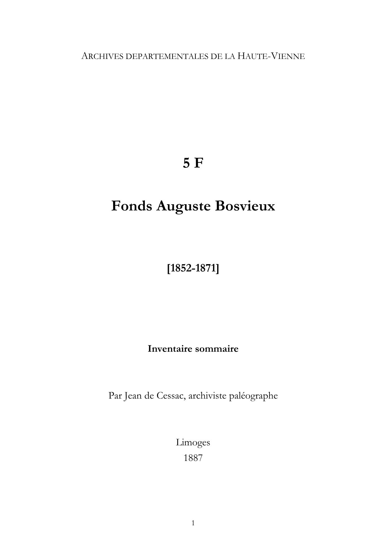 Ce fonds d’envergure encyclopédique, légué en 1871 par A. Bosvieux (1831-1871), archiviste de la Creuse et de Lot-et-Garonne, est constitué pour l'essentiel de notes d'érudition et de copies de documents concernant principalement la Marche, dont Alfred Leroux a publié une grande partie. Il contient l'analyse d'un grand nombre de documents médiévaux appartenant au fonds de la vicomté de Limoges, conservé aux archives départementales des Pyrénées-Atlantiques, et aussi des carnets archéologiques de voyages, où A. Bosvieux décrivait, et parfois dessinait les édifices et objets d'art qu'il examinait.