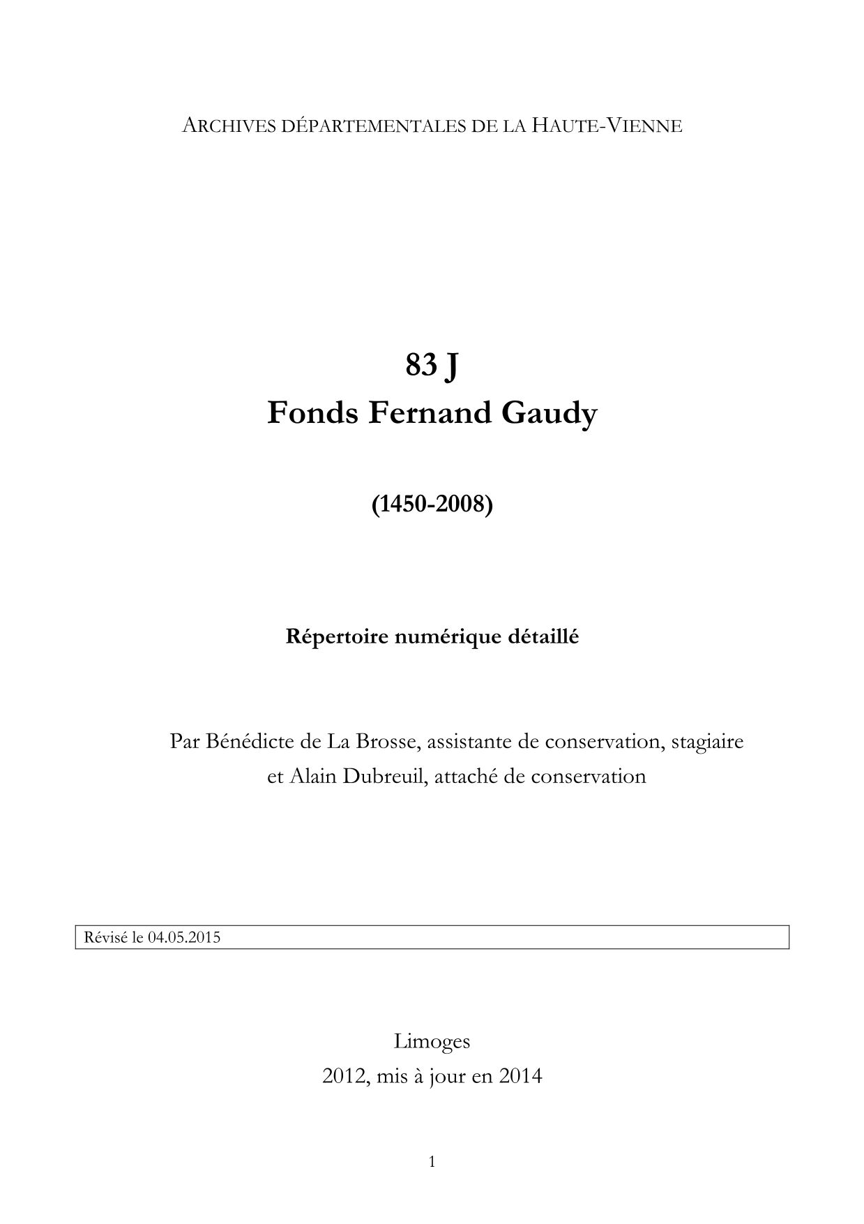 83 J. Répertoire numérique détaillé, par Bénédicte de La Brosse, 2012, mis à jour en 2014, 10 p. dact.