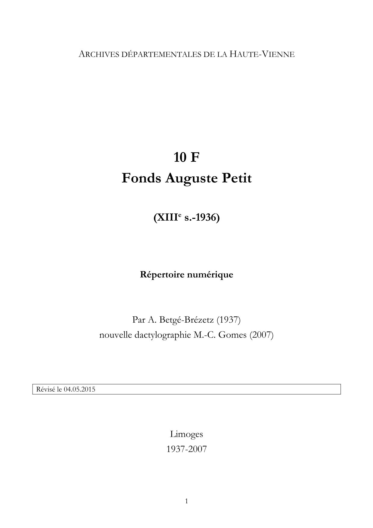 Correspondance historique et papiers personnels, notes et copies d’actes de l’érudit Auguste Petit (1867-1936), archiviste de la Corrèze puis de la Haute-Vienne de 1908 à 1933, concernant l’histoire et l’archéologie limousines. Les notes portent essentiellement sur la condition des biens et des personnes durant le Moyen Age et le XVIe siècle. Les notes intéressant l’histoire de la Corrèze et celle de l’hôpital de Tulle ont été remises aux archives départementales de la Corrèze.