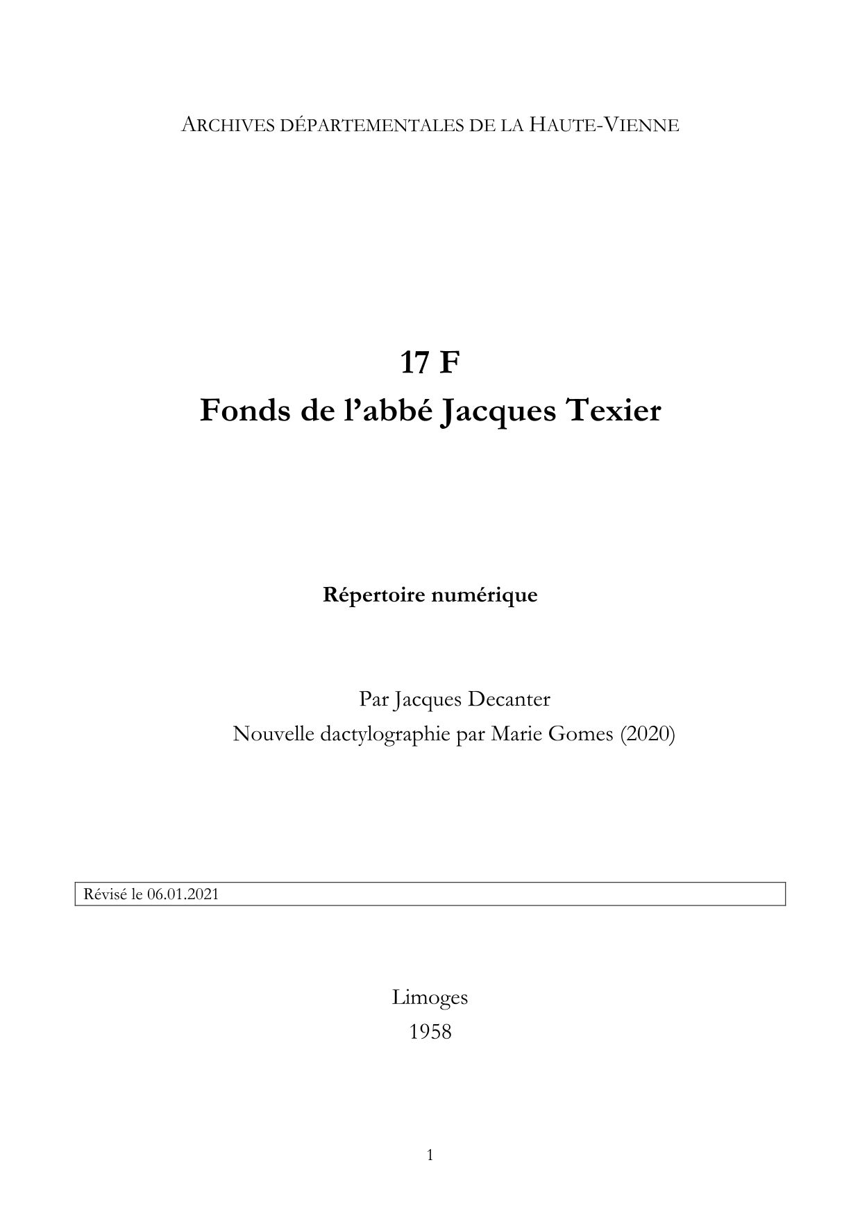 17 F. Répertoire numérique, par J. Decanter, 1958, 3 p. dact.