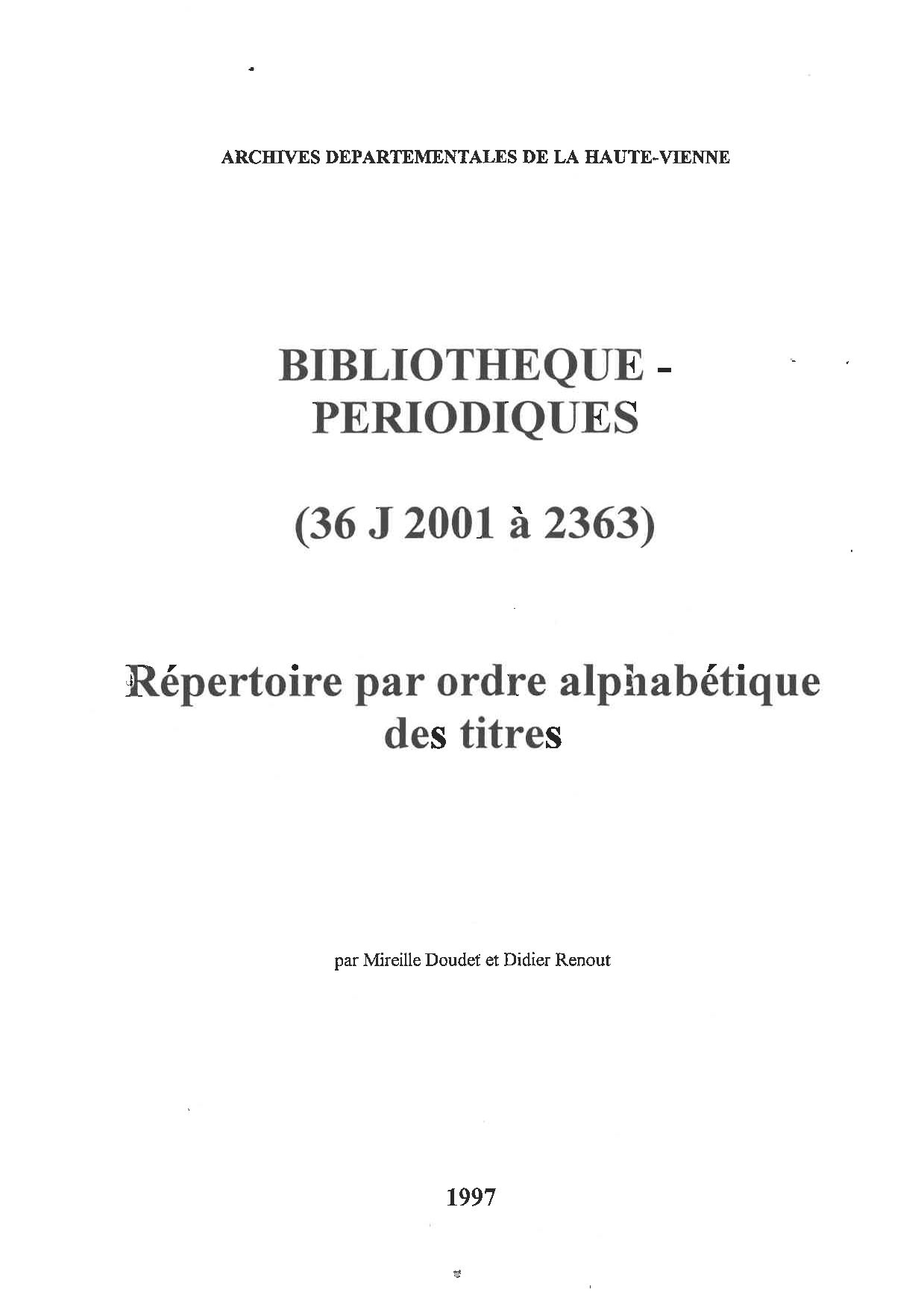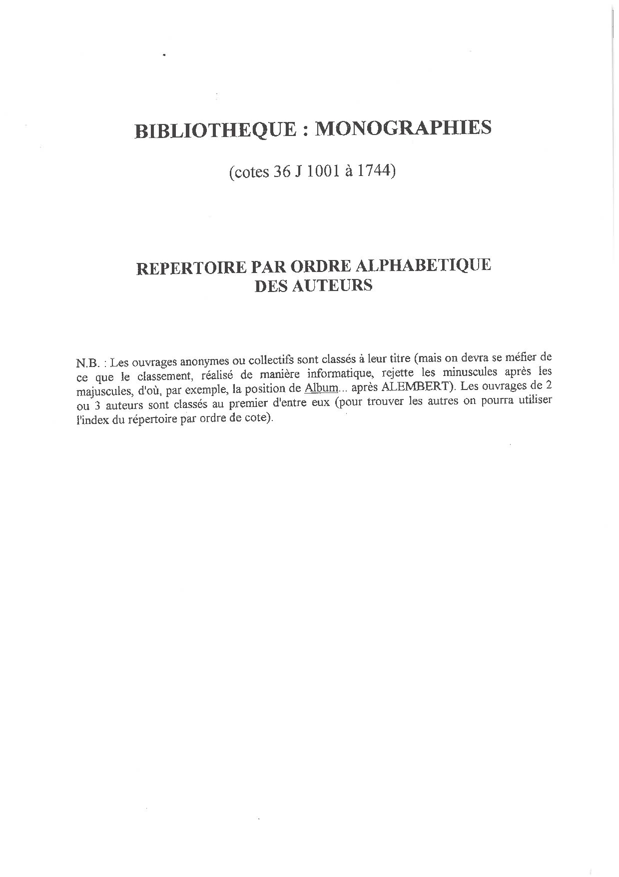 36 J. Répertoire numérique des archives, par M. Catherine et F. Bourdillaud, 1995, 7 p. dact. 36 J. Répertoire numérique de la bibliothèque (monographies), par D. Renout, 1997, 138 p. dact. 36 J. Répertoire numérique des périodiques, par M. Doudet et D. Renout, 1997, 27 p. dact.