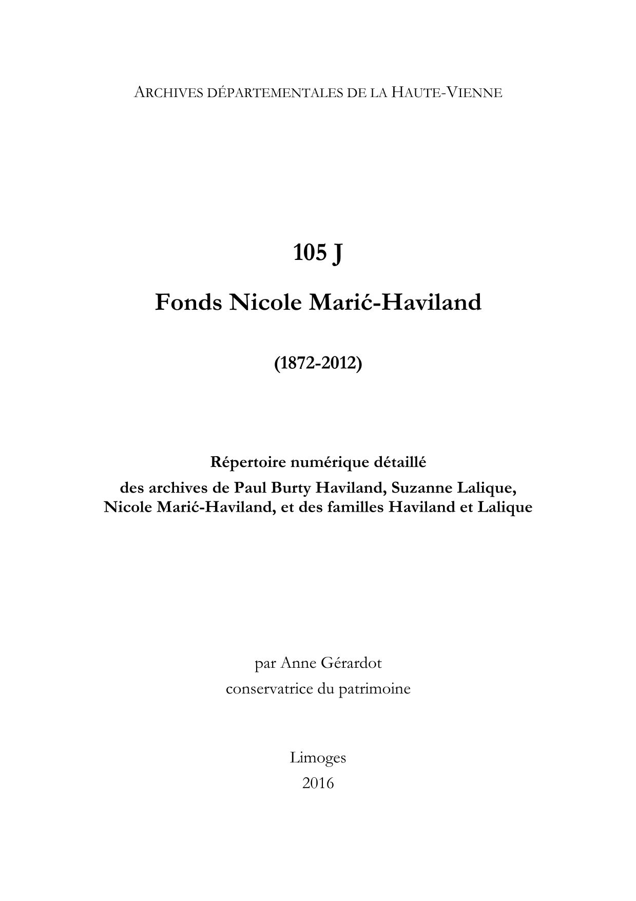 Répertoire numérique détaillé des archives de Paul Burty Haviland, Suzanne Lalique, Nicole Marić-Haviland, et des familles Haviland et Lalique, index, annexes, par A. Gérardot, 2016, 295 p.