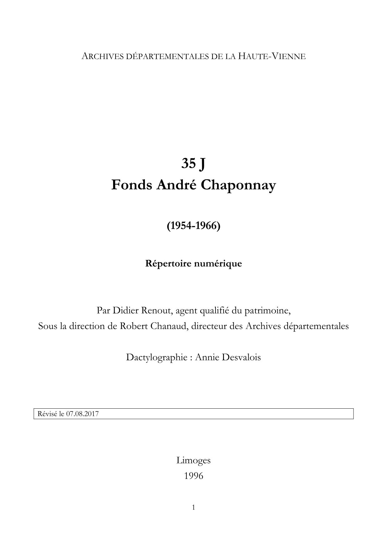 35 J. Répertoire numérique, par D. Renout, 1994, 10 p dact. Avant-propos d'André Chaponnay