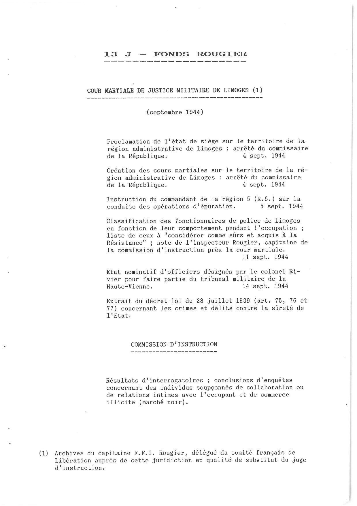Archives données en 1983 par le capitaine FFI, Théophile Rougier, délégué du comité français de Libération auprès de la cour martiale de justice militaire de Limoges, en qualité de substitut du juge d'instruction. Il s'agit de documents relatifs au fonctionnement de la cour martiale, des résultats d'interrogatoires et des conclusions d'enquêtes concernant des individus soupçonnés de collaboration. Voir aussi 184 W (Juridictions d'exceptions du ressort de la cour d'appel de Limoges, 1942-1945).