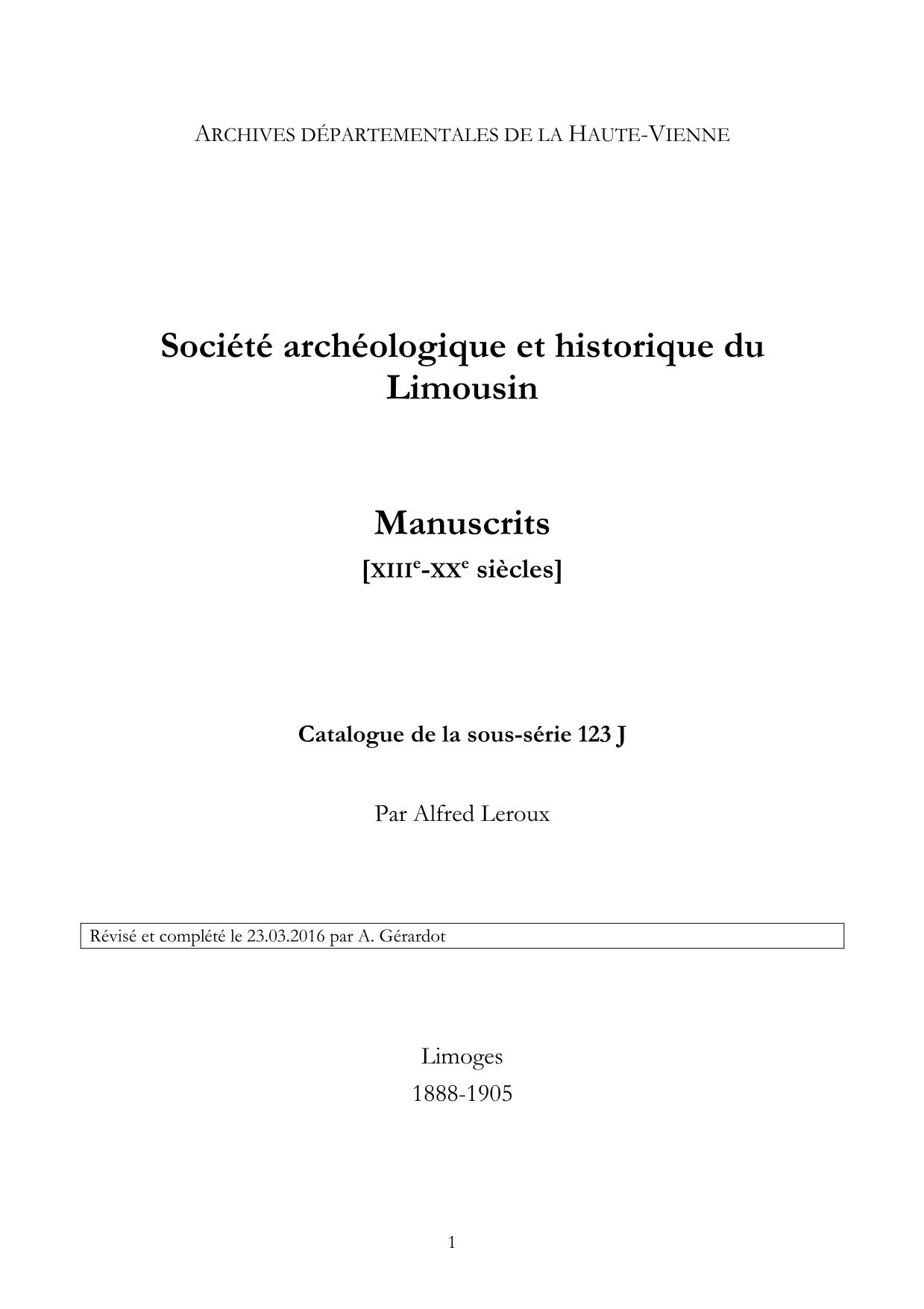123 J. Répertoire numérique, par A. Leroux, 1888-1905 [révisé et complété en 2016], 19 p. dact.